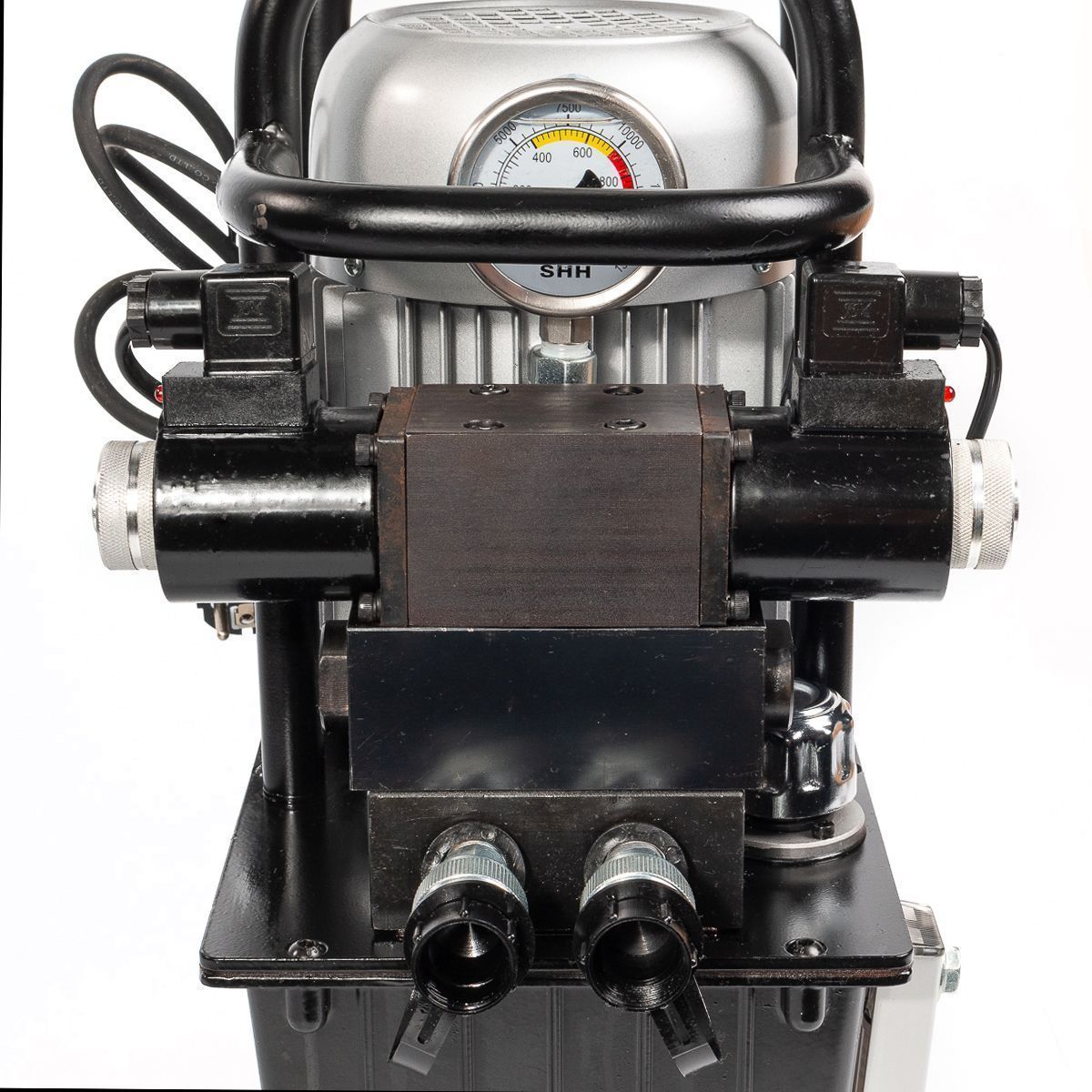 Модель оснащена электромагнитным трёхпозиционным гидрораспределителем, работающим в режимах «рабочий ход – удержание – возврат», что делает её особенно удобной для применения с домкратами, трубогибами и другим оборудованием, где важно фиксировать нагрузку. Двухступенчатое нагнетание давления обеспечивает быструю подачу и точное удержание усилия на рабочем режиме.