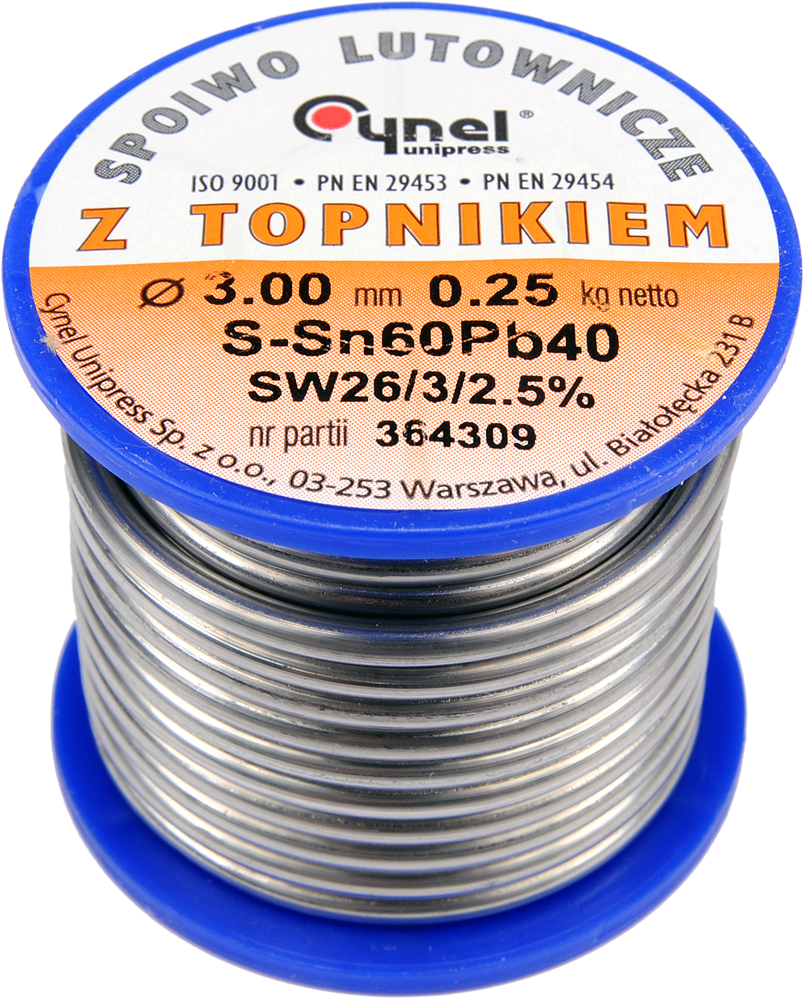 Припой с флюсом, полученный при первой плавке олова и свинца в соответствии с PN EN 29453: 2000, в процессе непрерывной разливки без доступа воздуха, затем экструдируется, что обеспечивает удаление оксидов. Связующее вещество толщиной 3,0 мм и массой 250 г с содержанием олова в продукте от 59,5 до 60,5% и температурой плавления от 183 ° C до 190 ° C. Флюс SW26 основан на канифоли и активаторе органического галогена, который после пайки становится «связанным» в канифоли, поэтому он не имеет прямого контакта с припоем и не вызывает коррозию, а также способствует плавлению и увеличивает текучесть припоя. Материал припоя в основном используется в электронной промышленности, для производства стандартных электронных устройств и компонентов, а также в электротехнике.