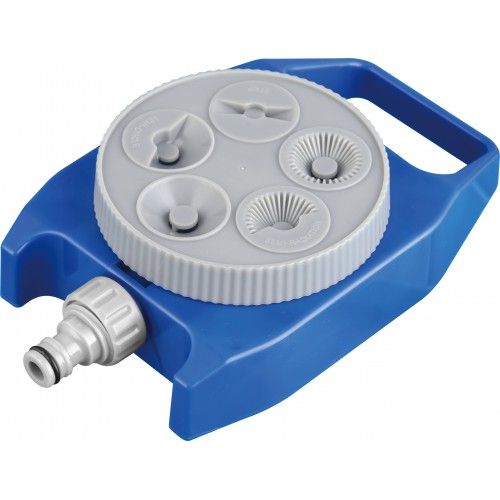 Разбрызгиватель стационарный пластмассовый для установки на землю. Имеет переключатель режимов полива на 5 функций, аналогичный переключателям в поливочных пистолетах.