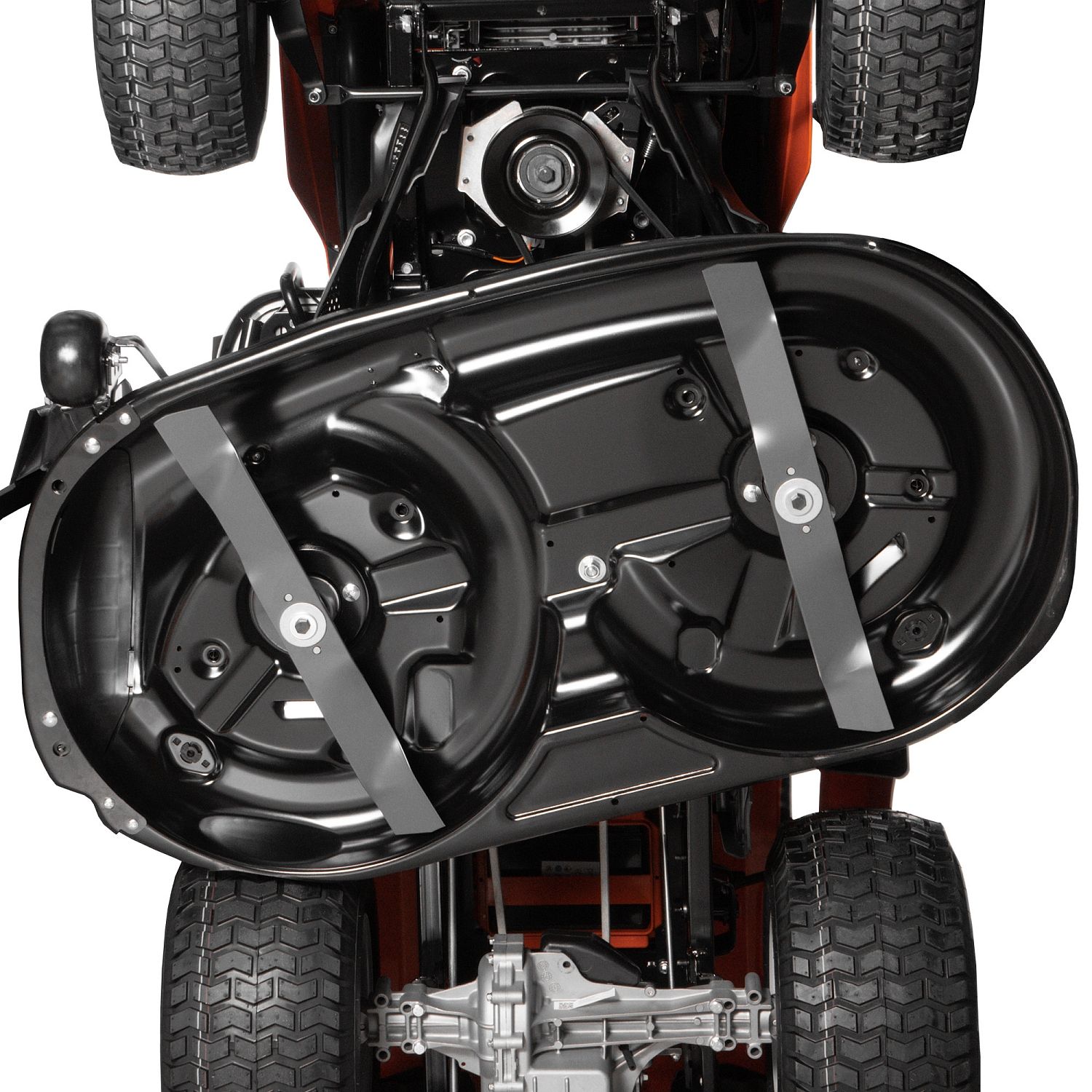 - Безопасная система кошения с двумя ножами. Плавающая двухножевая дека обеспечивает высокую эффективность кошения. Дополнительные ролики расположенные на корпусе деки позволяют плавно проезжать неровности, без риска повредить ножи.