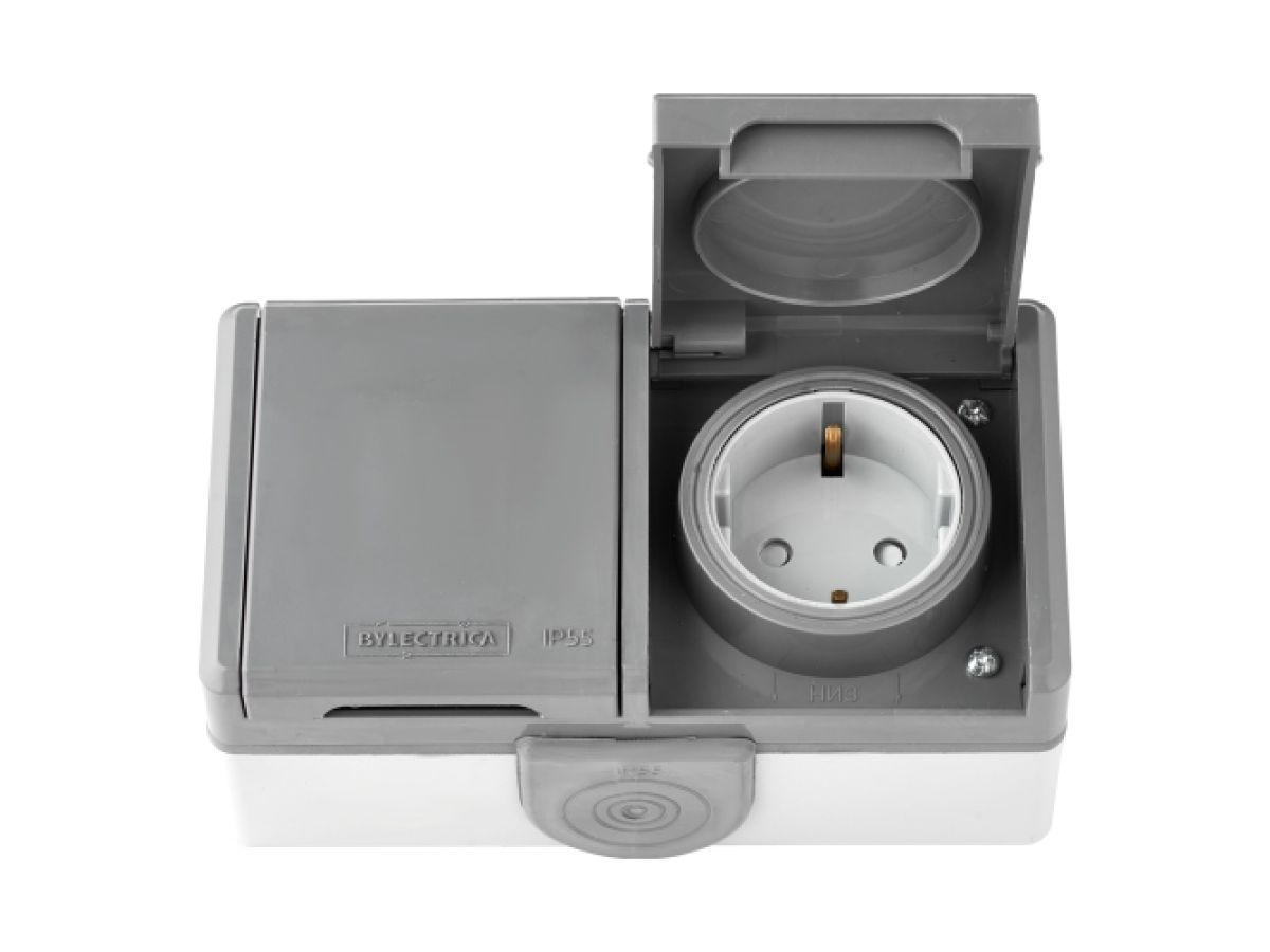 Розетка 2-ая (открытая, с/з, з/ш, брызг. защ.) белая, Пралеска Аква BYLECTRICA РА16-103