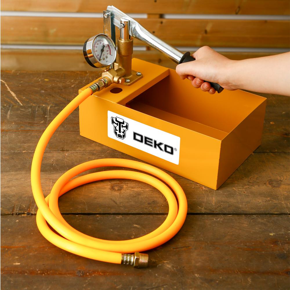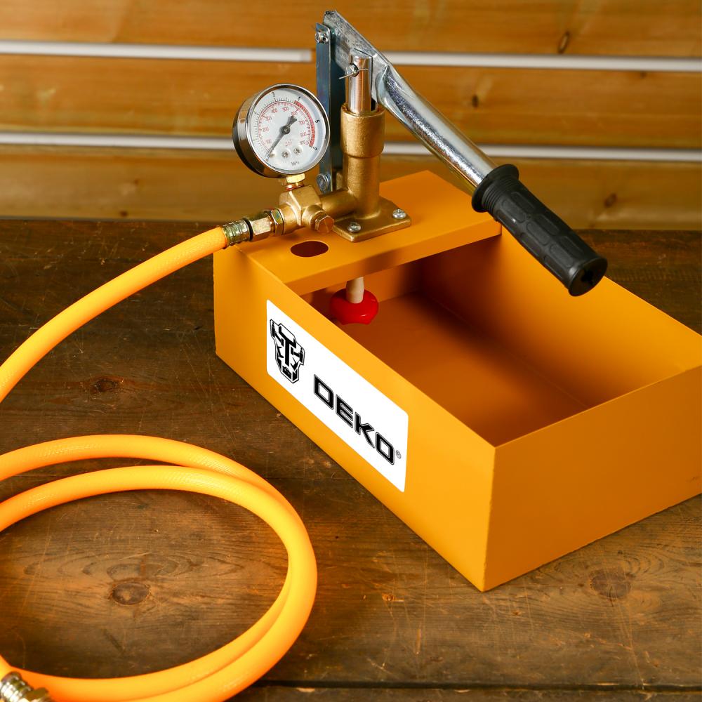 - Ручной опрессовщик DEKO HTP01 незаменим в тех случаях, когда необходимо провести испытания трубопроводных систем и проверить их герметичность.
