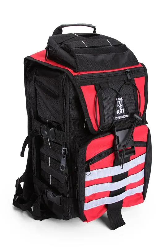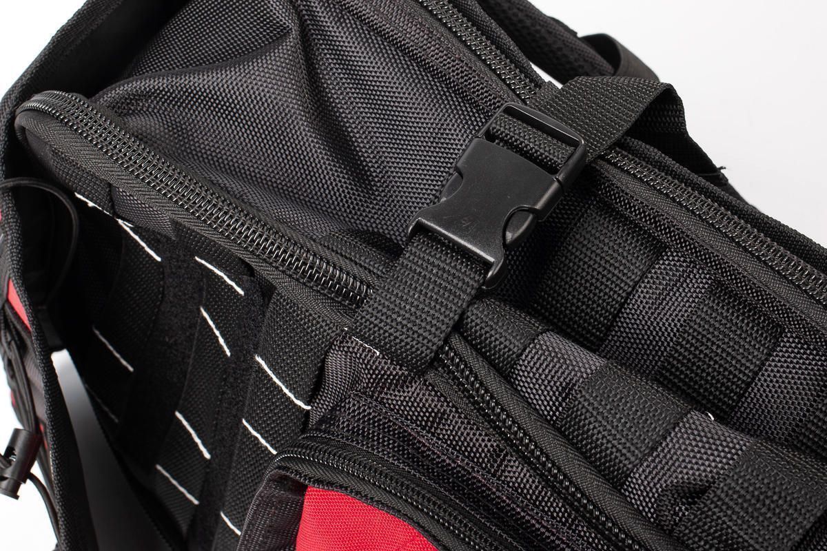 - верхний клапан рюкзака оборудован 2 карманами на молнии и 6 крепежными элементами из капроновой ленты