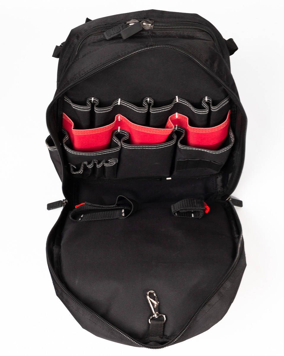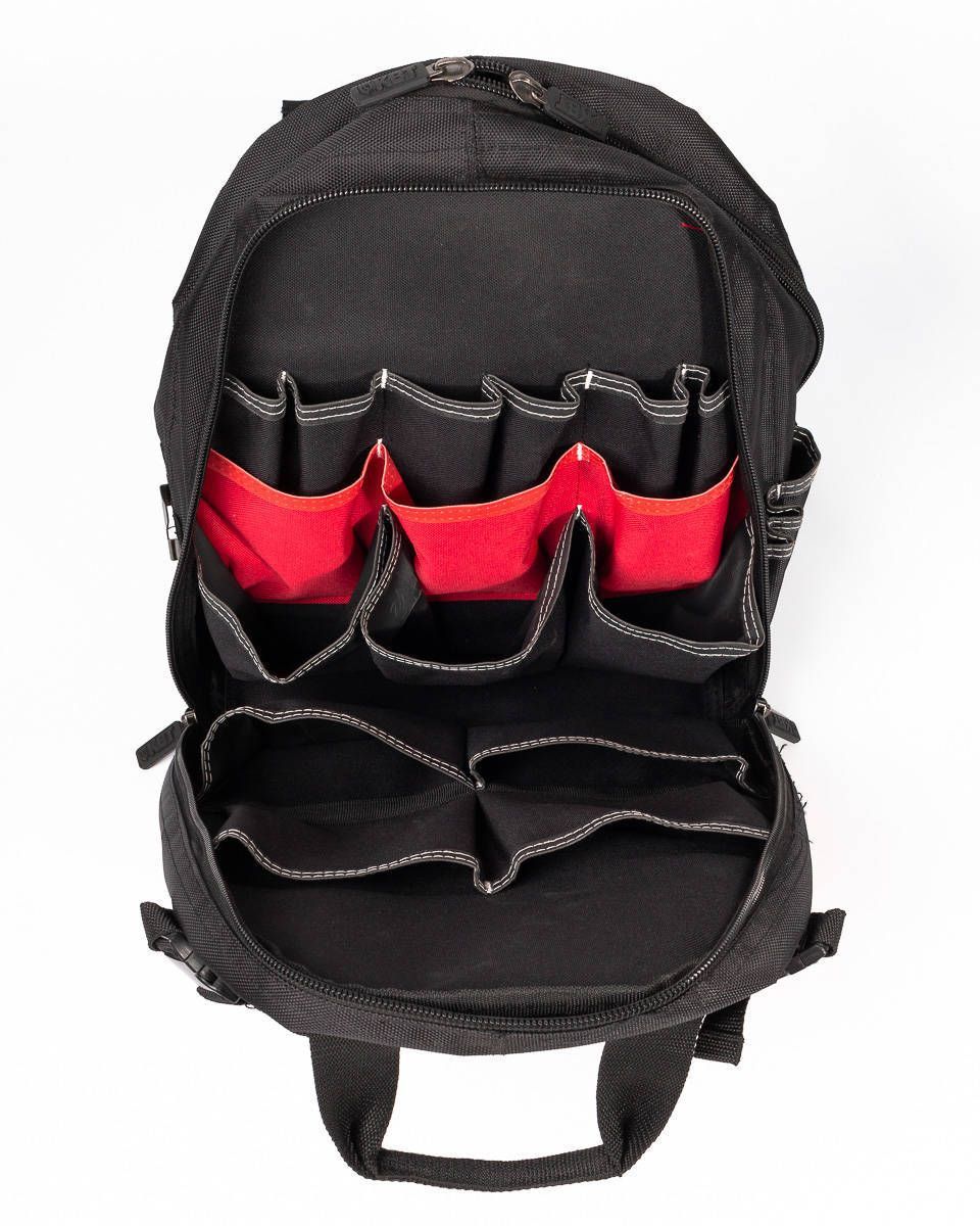 - 1 заднее внутреннее отделение с 6 карманами, 10 мини-карманами для узких предметов, 6 капроновыми крепежными элементами и металлическим карабином