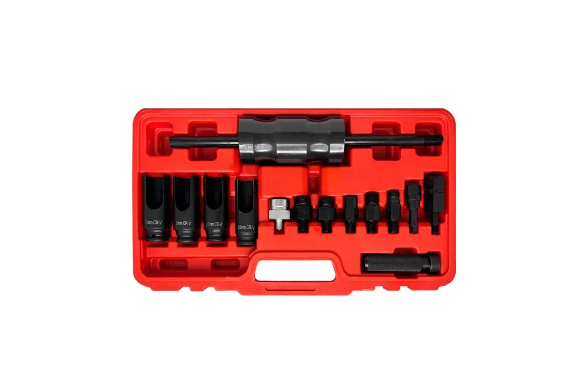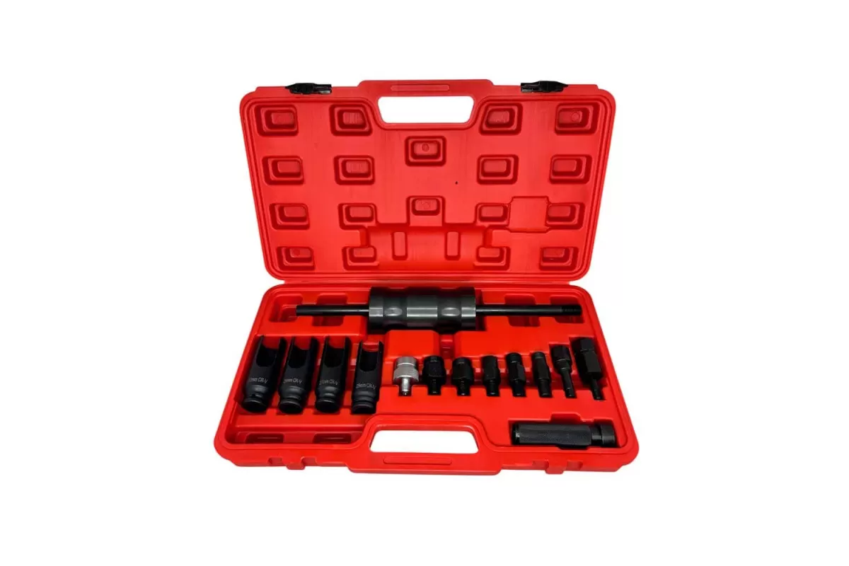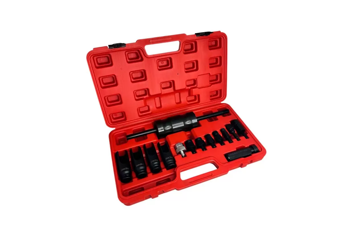 Количество предметов: 14 предметов, включает универсальный удaрный съёмник и набор адаптеров для разных производителей форсунок (Bosch, Delphi, Denso и др.).