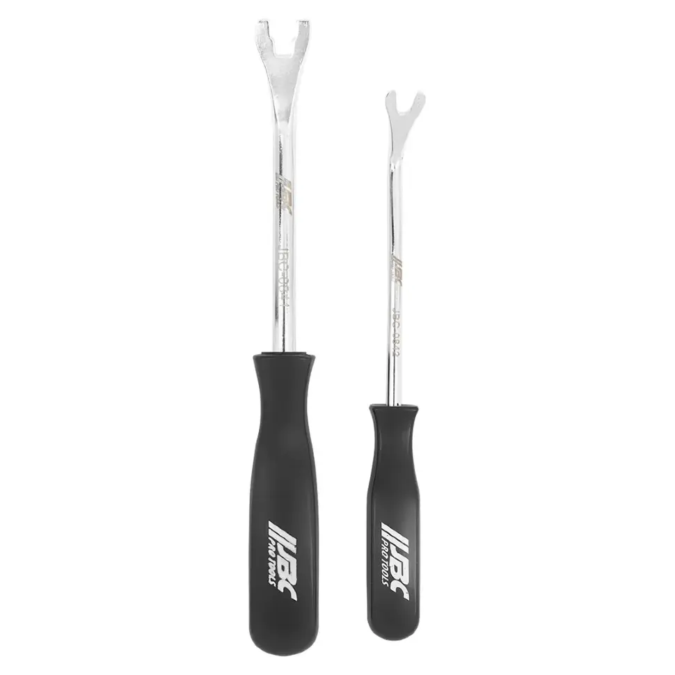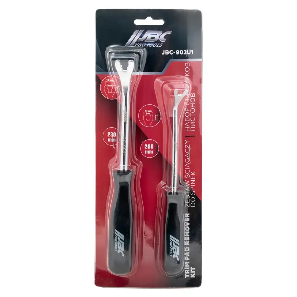 Съёмник пистонов, 2 пр. JBC‑902U1 — набор из двух металлических съёмников типа «вилка» для быстрого и аккуратного демонтажа пластиковых пистонов, клипс и фиксаторов обшивки.
