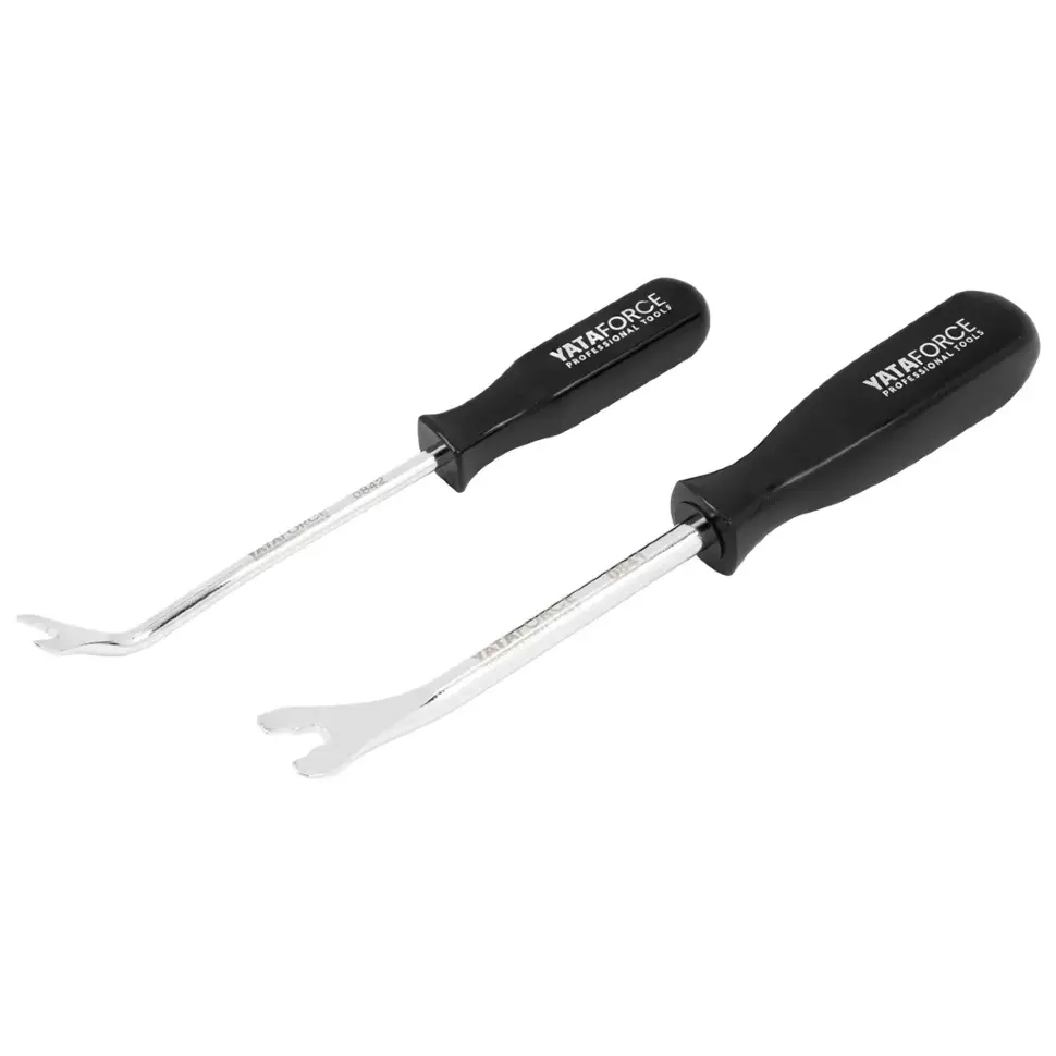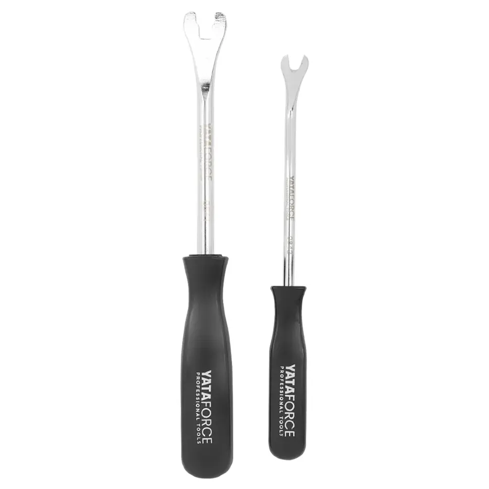 Съёмник пистонов, 2 пр. YATAFORCE YF‑902U1 — набор из двух металлических съёмников типа «вилка» для быстрого и аккуратного демонтажа пластиковых пистонов, клипс и фиксаторов обшивки.Разная длина инструментов (около 200 мм и 230 мм) позволяет работать как в открытых, так и в труднодоступных местах.