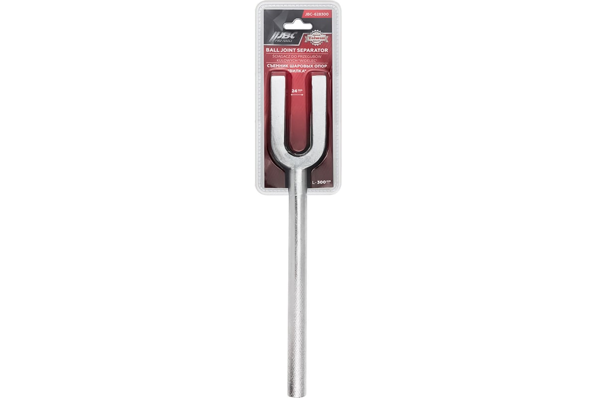 Съёмник шаровых опор «вилка» JBC‑628300, 300 мм — надёжный инструмент для демонтажа шаровых опор и рулевых наконечников. Вилочная форма обеспечивает быстрый и безопасный съём без повреждения деталей подвески. Изготовлен из прочной инструментальной стали, устойчивой к ударным нагрузкам и коррозии. Размер зева — 24 мм, что делает съёмник универсальным для большинства легковых автомобилей. Подходит как для профессионального использования в СТО, так и для самостоятельного ремонта в гараже.