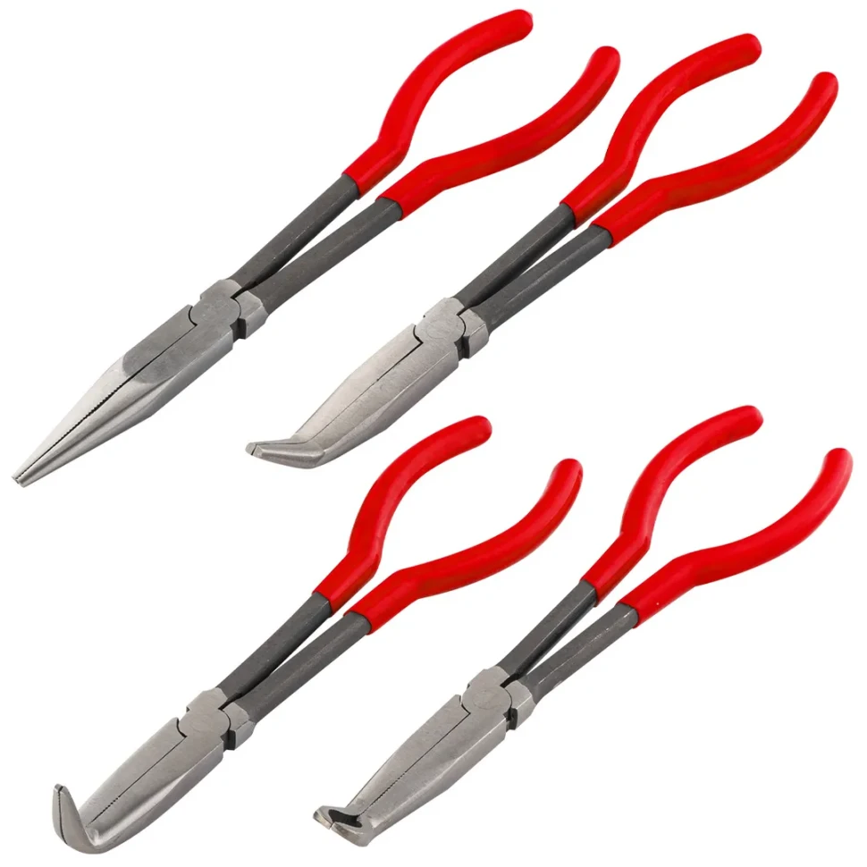Набор из четырех щипцов с удлиненными рукоятками длиной 285 мм включает универсальные инструменты для различных задач: щипцы с изогнутыми губками под углом 45 градусов, с изогнутыми губками под углом 90 градусов, прямые щипцы и щипцы с закругленными губками для работы с шлангами.