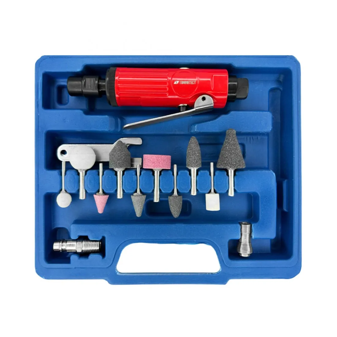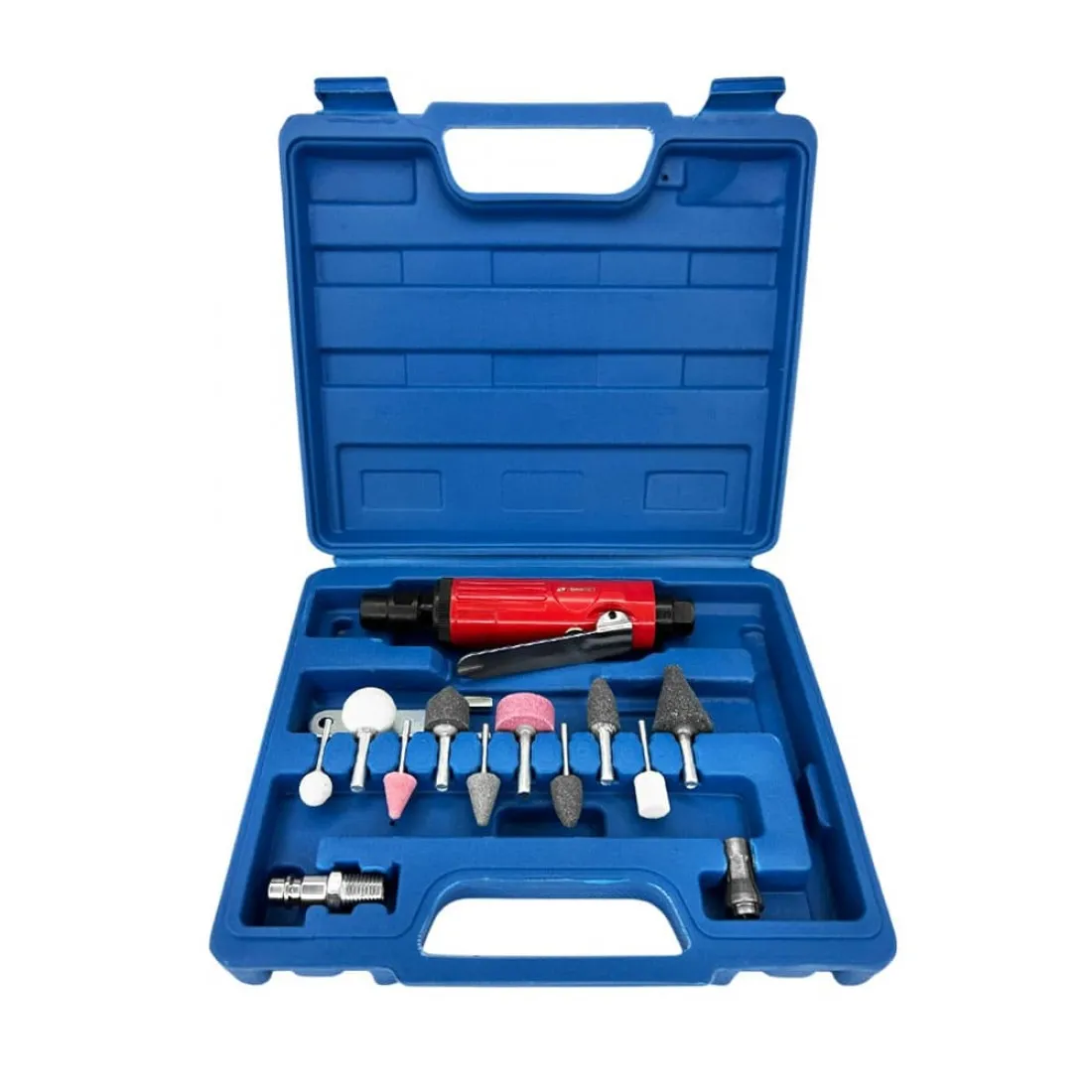 Для стабильной и долговечной работы рекомендуется подключать через фильтр‑регулятор с масленкой и обеспечивать чистый сухой воздух; инструмент совместим с широким набором шлифовальных насадок благодаря цангам 1/4" и 1/8".
