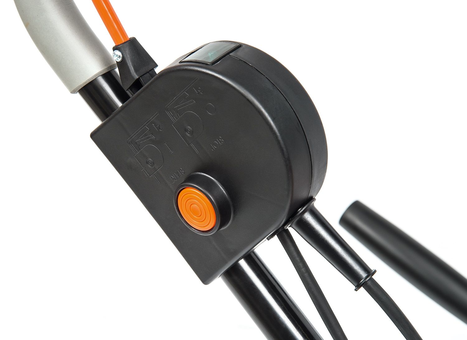 ✔ Удобное хранение и транспортировка достигаются за счет складной рукоятки и возможности быстрого отсоединения трубы выброса.