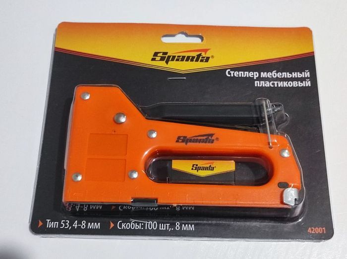 Пластиковый мебельный степлер Sparta 42001 совместим с крепежами типа 53 размером 4-8 мм и поставляется со скобами в количестве 100 шт. Используется для быстрого скрепления с деревянным основанием фанеры, оргалита, ДСП, ДВП, пленки, утеплителя и других листовых материалов. Будет полезен при сборке шкафов, обивке мягкой мебели, при выполнении теплоизоляционных и других крепежных работ.