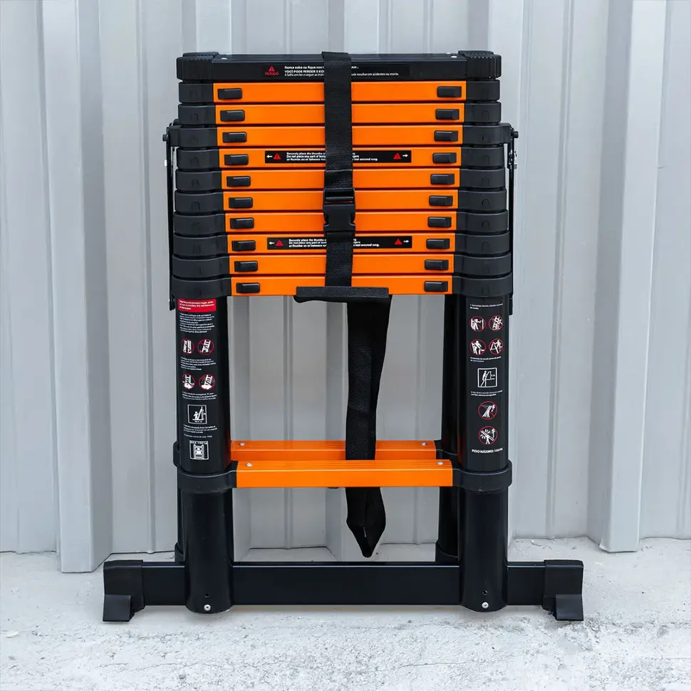 Изготовлена из прочного алюминия, устойчива к коррозии и рассчитана на длительный срок службы. Каждая секция оснащена надёжными фиксаторами ступеней, а противоскользящие наконечники на опорах обеспечивают дополнительную безопасность. В сложенном виде стремянка занимает минимум места.
