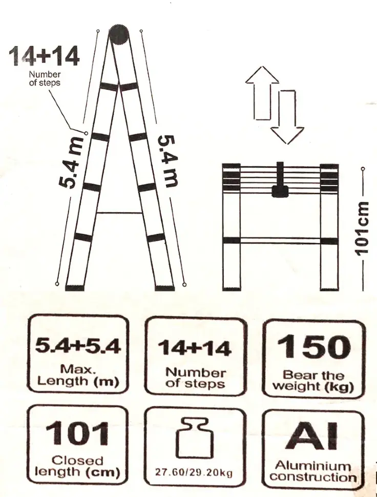 Модель состоит из двух секций по 5,4 м с односторонним восхождением, что даёт возможность использовать её как стремянку или как приставную лестницу. Прочный алюминиевый сплав обеспечивает лёгкость конструкции и устойчивость к коррозии, а автоматические замки ступеней и противоскользящие наконечники повышают безопасность при работе. Широкие рифлёные ступени обеспечивают комфорт даже при длительном использовании.