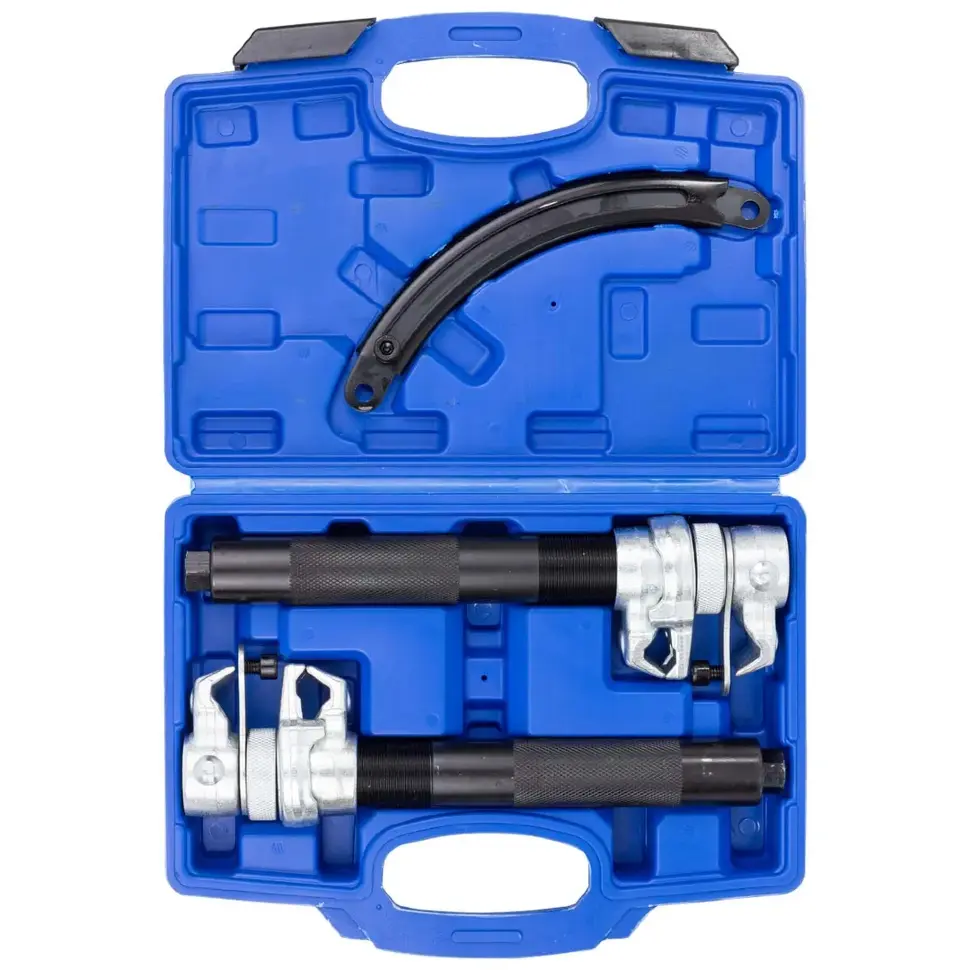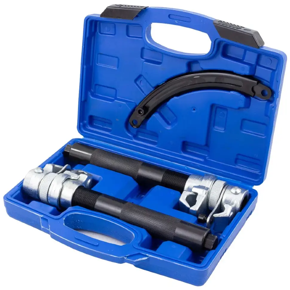Конструкция выполнена из прочной стали, что обеспечивает долговечность и устойчивость к нагрузкам. Винтовой механизм с крупной резьбой позволяет плавно и контролируемо сжимать пружину, а предохранительная дуга повышает безопасность работы. Подходит для обслуживания легковых автомобилей и лёгкой коммерческой техники.