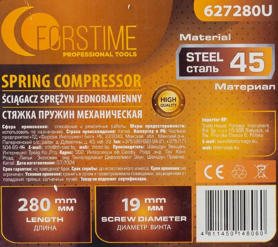 Стяжка пружин механическая усиленная (23-280мм, Ø винта 19мм, к-т 2шт, нагр. на пару 1200кг) FORSTIME FT-627280U
