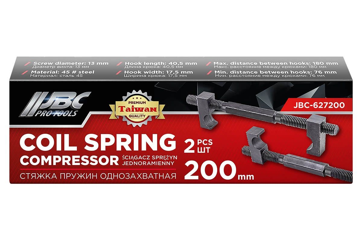 Стяжка пружин однозахватная JBC-627200 — это комплект из 2 инструментов длиной 200 мм, предназначенных для безопасного сжатия пружин при ремонте и обслуживании подвески автомобиля. Подходит для использования как в автосервисах, так и в гаражных условиях.