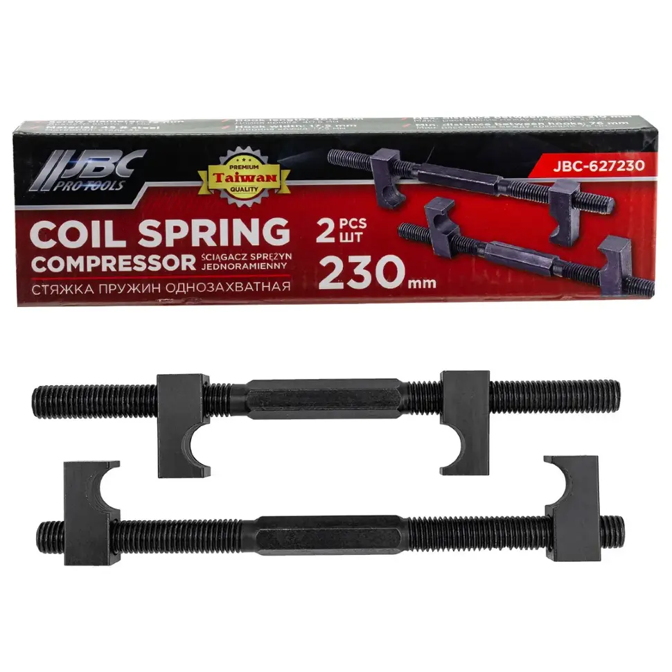 Стяжка пружин однозахватная JBC-627230 — это комплект из 2 инструментов длиной 230 мм, предназначенных для безопасного сжатия пружин при их демонтаже и установке в подвеске автомобиля. Подходит для использования как в автосервисах, так и в условиях домашней мастерской.