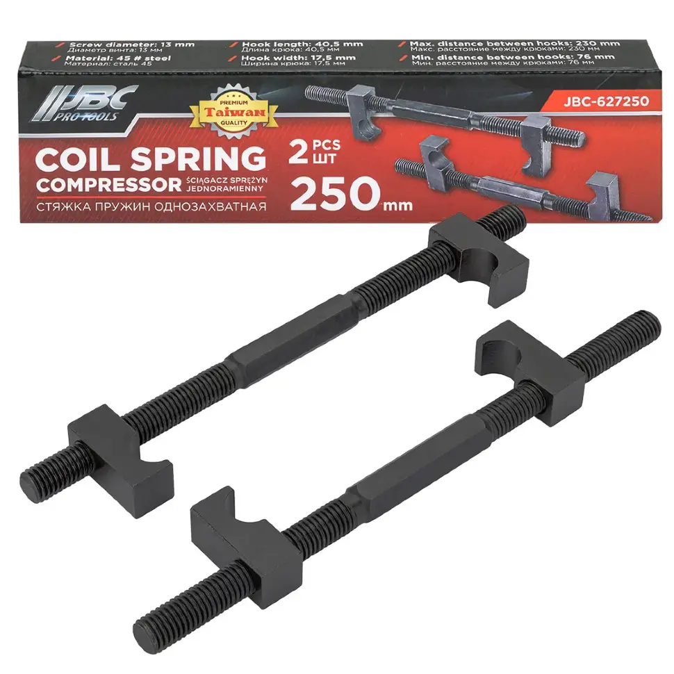 Стяжка пружин однозахватная JBC-627250 — это комплект из 2 инструментов длиной 250 мм, предназначенных для безопасного и надёжного сжатия пружин при ремонте и обслуживании подвески автомобиля. Подходит для использования как в автосервисах, так и в условиях домашней мастерской.