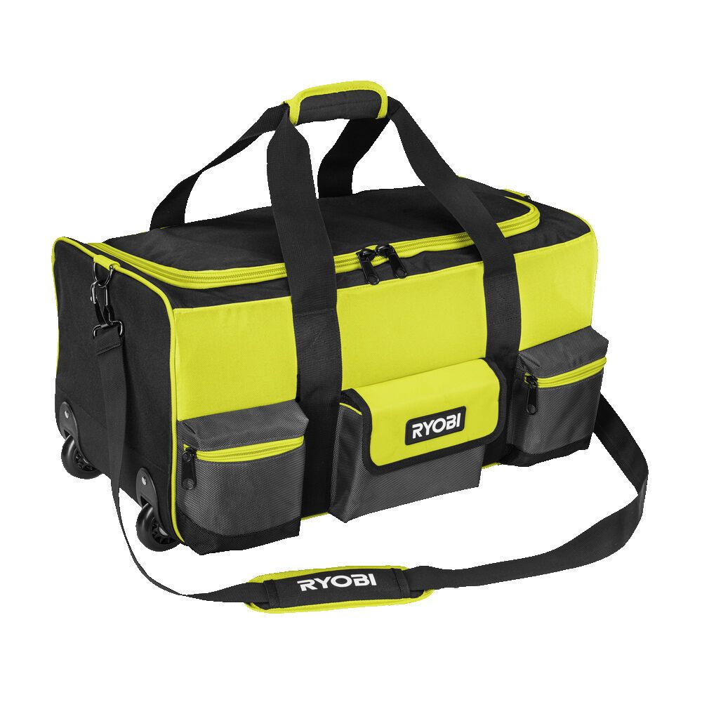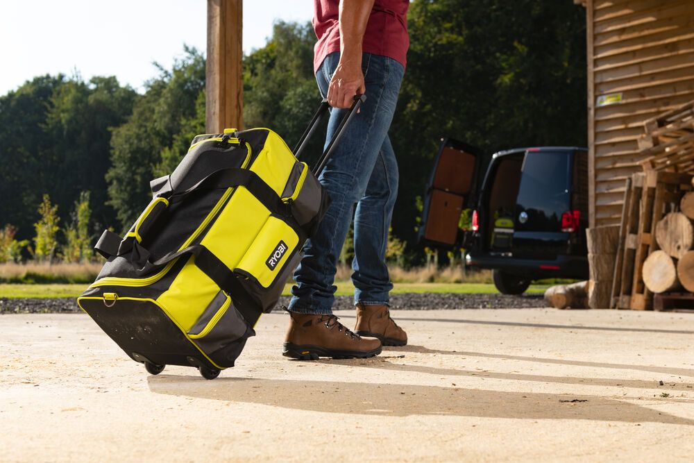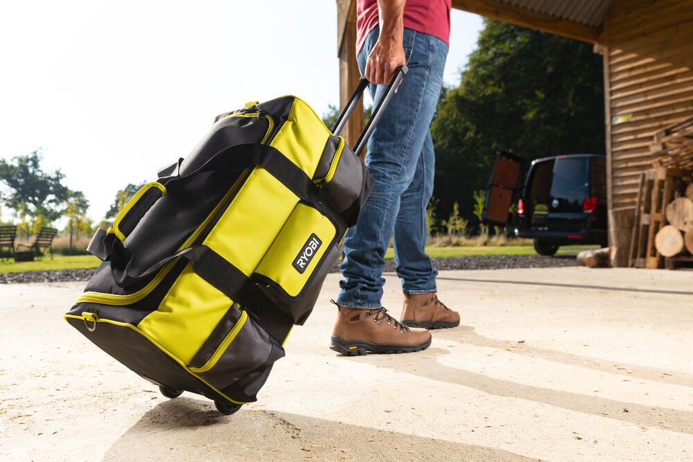 - Ryobi Сумка для инструмента с колесиками большая. Емкость 49л. Рассчитана на работу в тяжелых условиях независимо от того, работаете ли вы в пыльном помещении или после дождливого дня.