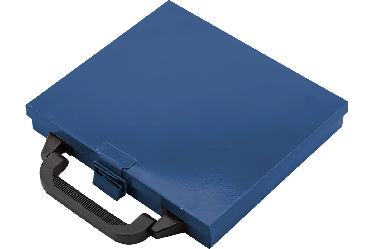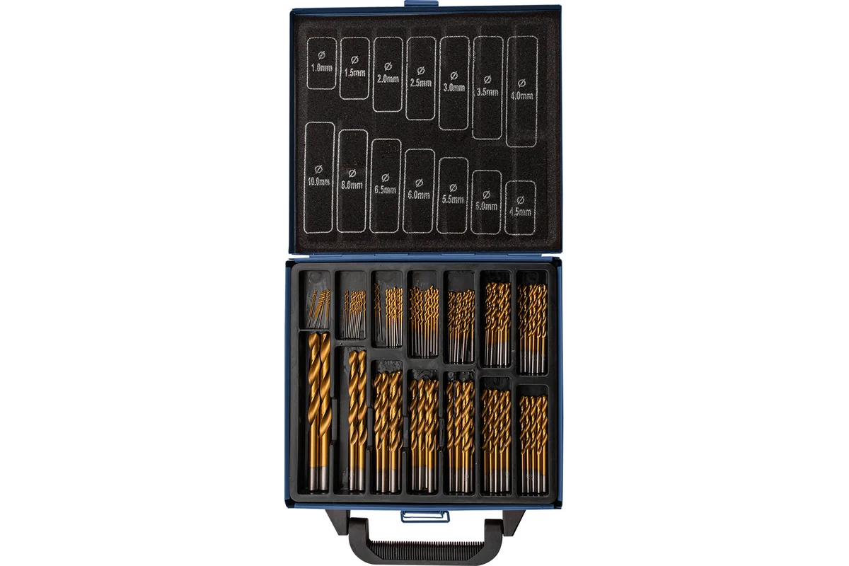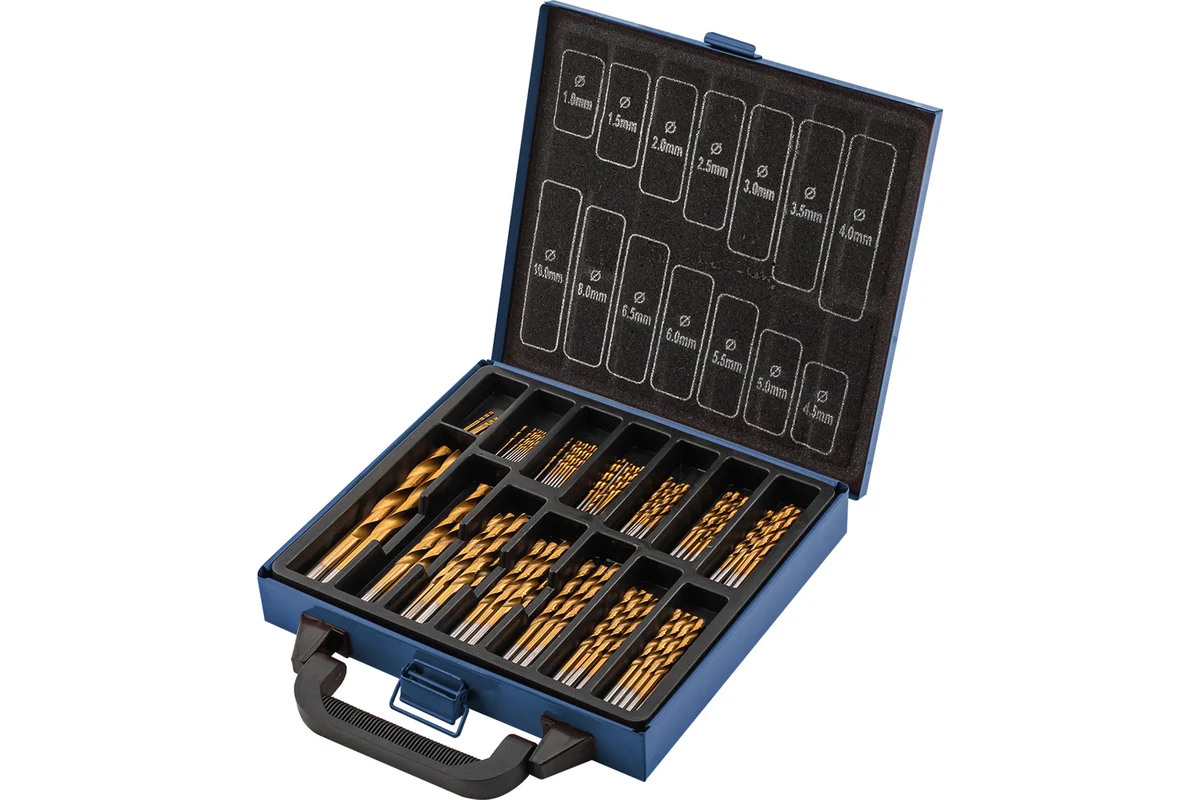 Удобство хранения. Поставка в прочном металлическом кейсе с индивидуальными ячейками для сверл обеспечивает порядок и защиту, что упрощает поиск нужного сверла во время работы.