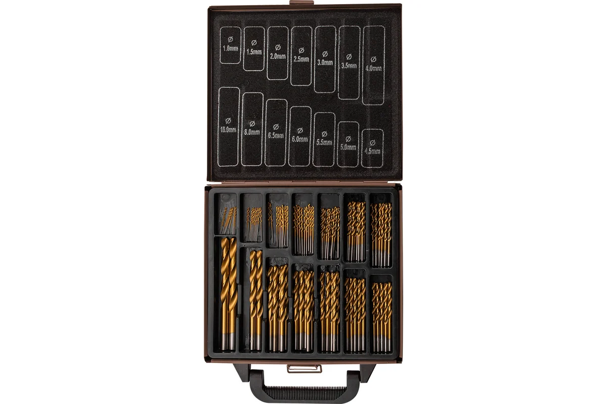 Диаметры и количество: 10 шт × 1.0 мм; 10 шт × 1.5 мм; 10 шт × 2.0 мм; 10 шт × 2.5 мм; 10 шт × 3.0 мм; 10 шт × 3.5 мм; 10 шт × 4.0 мм; 5 шт × 4.5 мм; 5 шт × 5.0 мм; 5 шт × 5.5 мм; 5 шт × 6.0 мм; 5 шт × 6.5 мм; 2 шт × 8.0 мм; 2 шт × 10.0 мм.