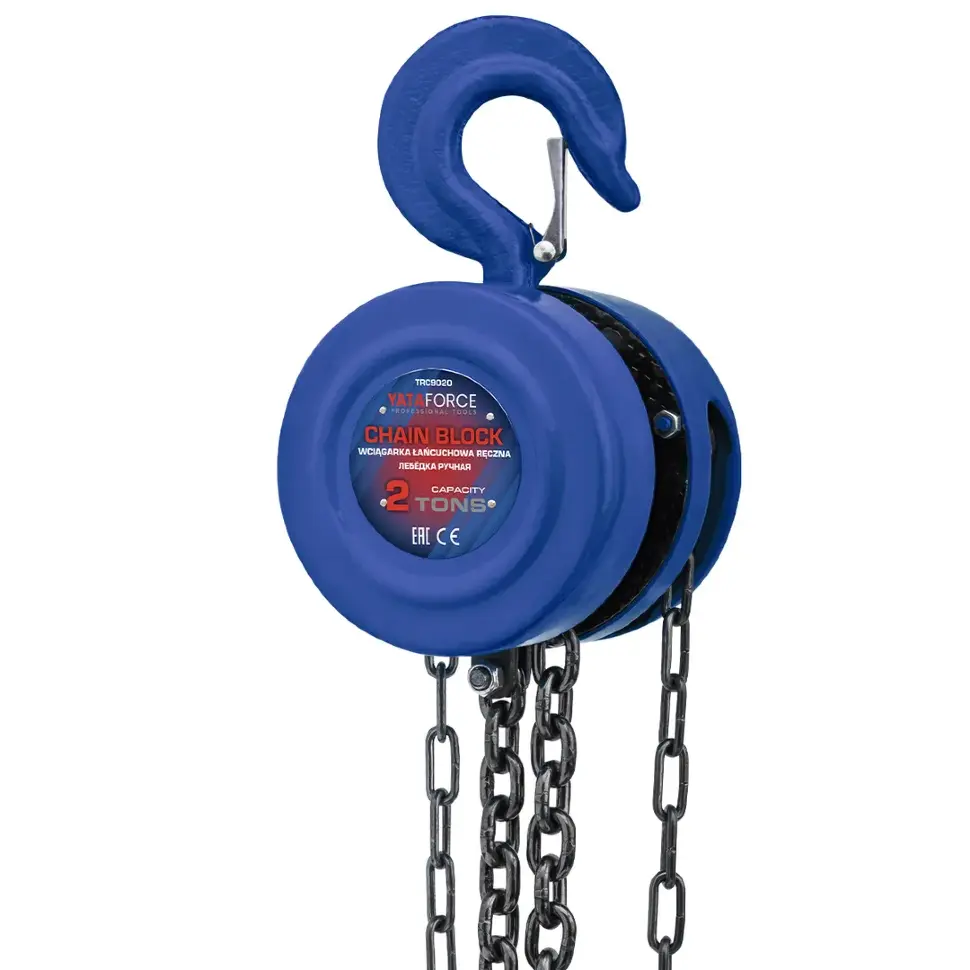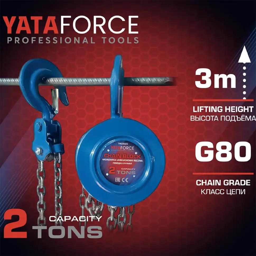 Таль ручная 2т YATAFORCE YF‑TRC9020 — прочное и надёжное грузоподъёмное устройство, предназначенное для подъёма и удержания грузов весом до 2000 кг. Работает по принципу цепной тали: усилие передаётся через систему блоков и цепь, что позволяет оператору вручную поднимать тяжёлые предметы без применения электроэнергии.
