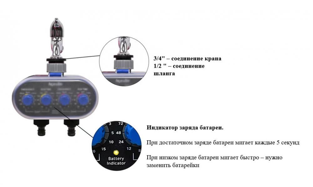 - Предназначен для автоматического полива в системах орошения, оснащен световым индикатором заряда батареи.