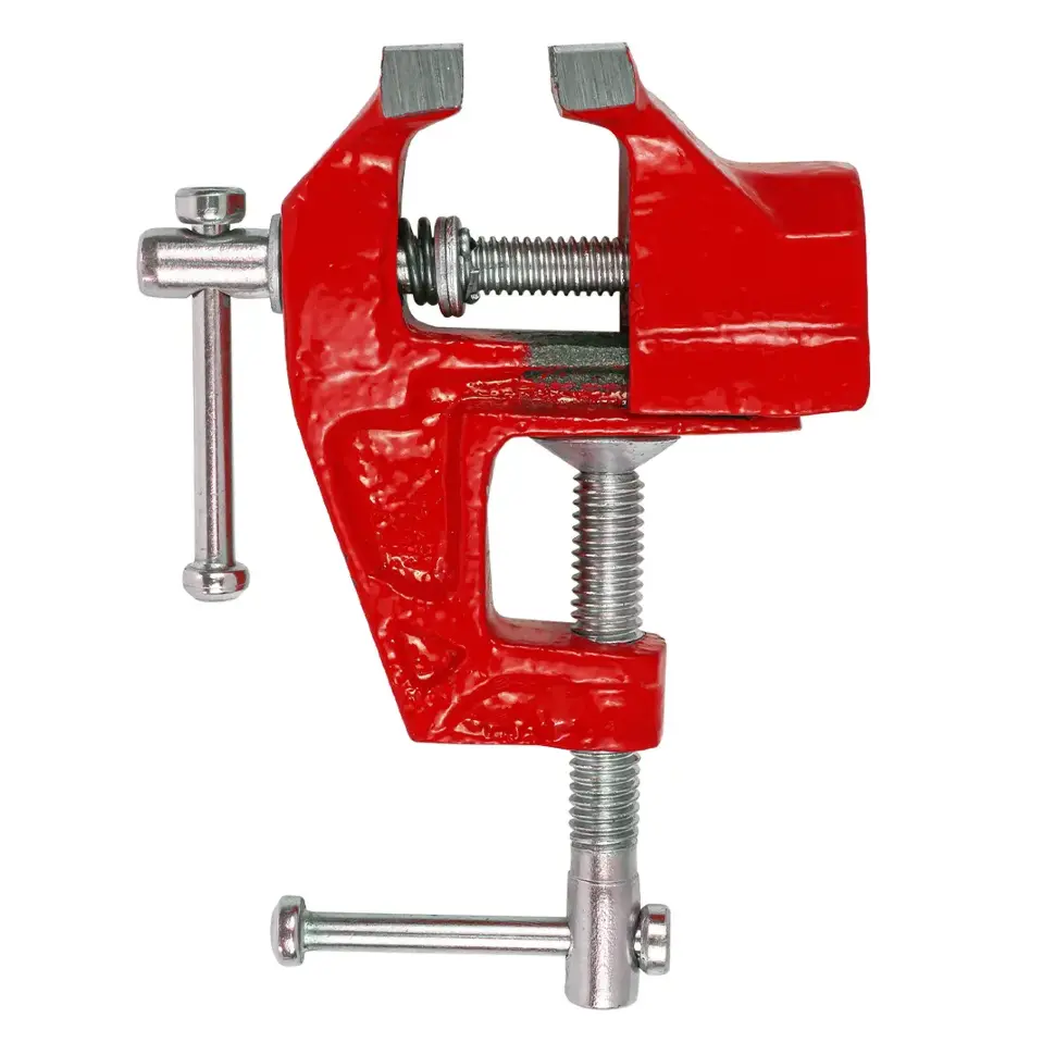 Корпус выполнен из прочного металла с антикоррозийным покрытием. Винтовой механизм обеспечивает плавную регулировку усилия зажима, а настольное крепление позволяет надёжно зафиксировать тиски на рабочей поверхности.