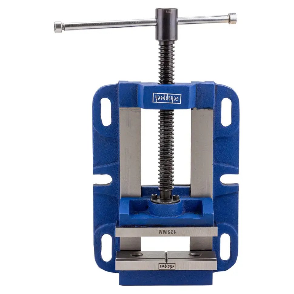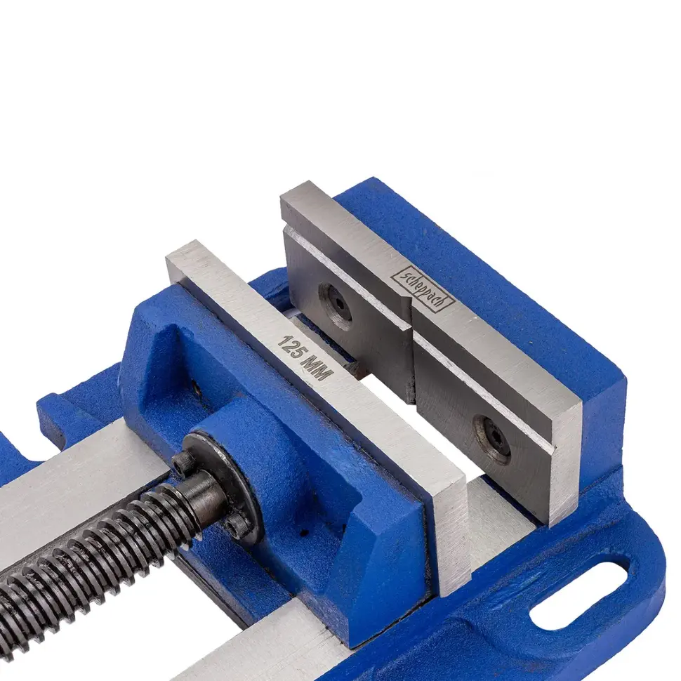 Станочные тиски Scheppach Sch‑6540405 — прочный и надёжный инструмент для фиксации заготовок при работе на сверлильных и фрезерных станках. Низкий профиль конструкции обеспечивает устойчивость и минимизирует вибрацию, а продолговатые крепёжные отверстия позволяют точно позиционировать тиски на рабочем столе. Мощный прижимной винт с трапециевидной резьбой гарантирует равномерное усилие зажима, а V‑образные пазы на одной из губок обеспечивают аккуратную фиксацию цилиндрических деталей без повреждения поверхности. Ширина губок 125 мм и раскрытие 150 мм подходят для работы с крупными заготовками, а стальной корпус обеспечивает долговечность.