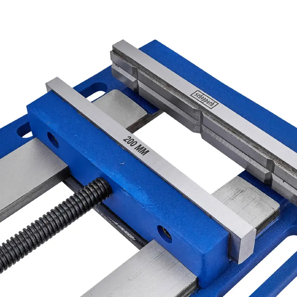 - Ширина губок — 200 мм / рабочий ход — 200 мм — подходит для фиксации крупногабаритных деталей.