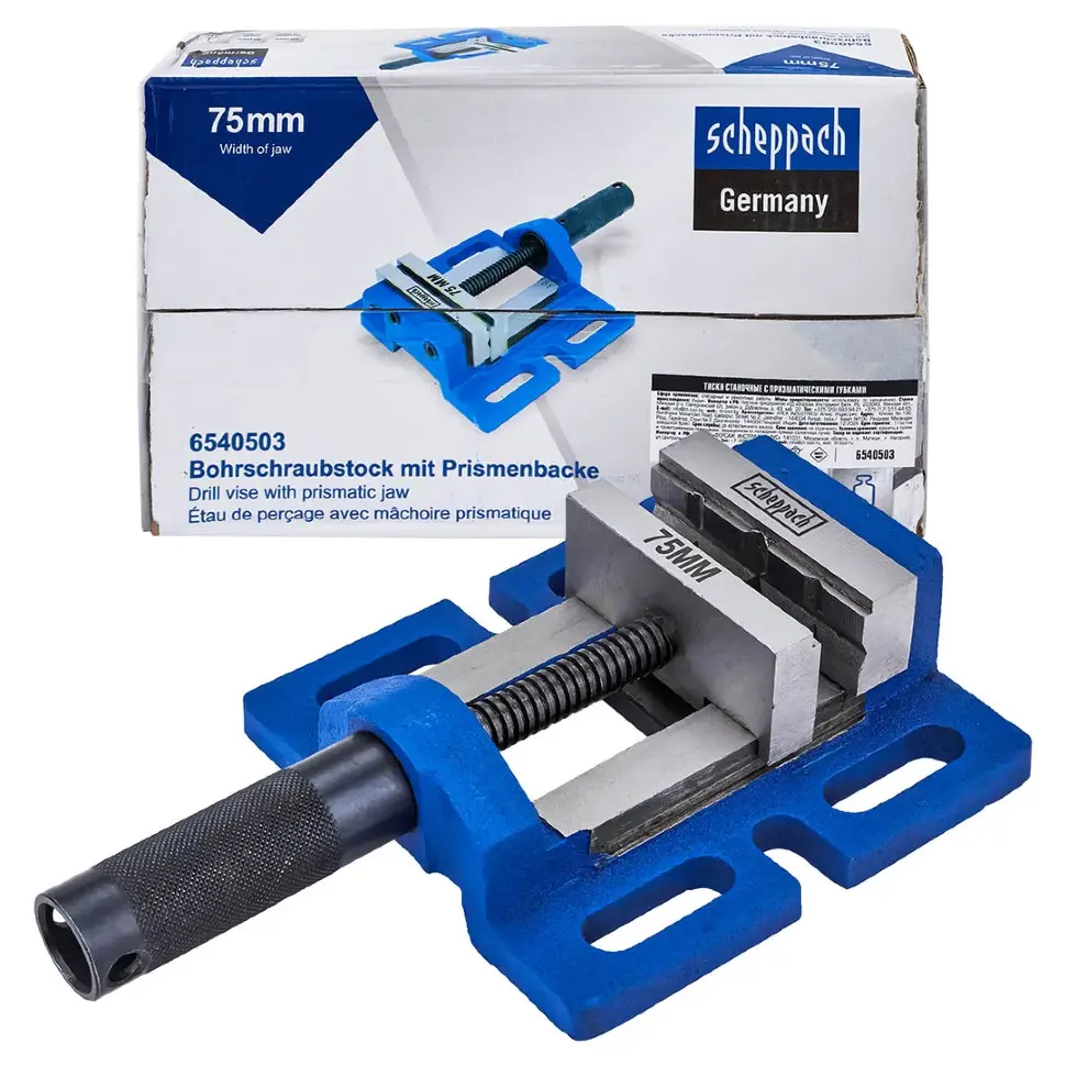 Станочные тиски Scheppach Sch‑6540503 — компактный инструмент с шириной губок 75 мм, предназначенный для точной фиксации мелких заготовок при сверлении и фрезеровании.