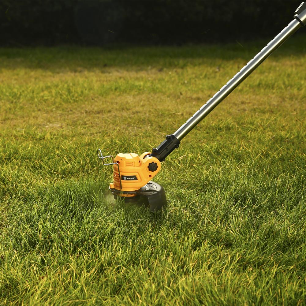 - Триммер садовый аккумуляторный DEKO DKTR12 - компактная модель, удобная для скашивания травы в труднодоступных местах, вдоль заборов, клумб, подравнивания газонов, краев садовых дорожек.
