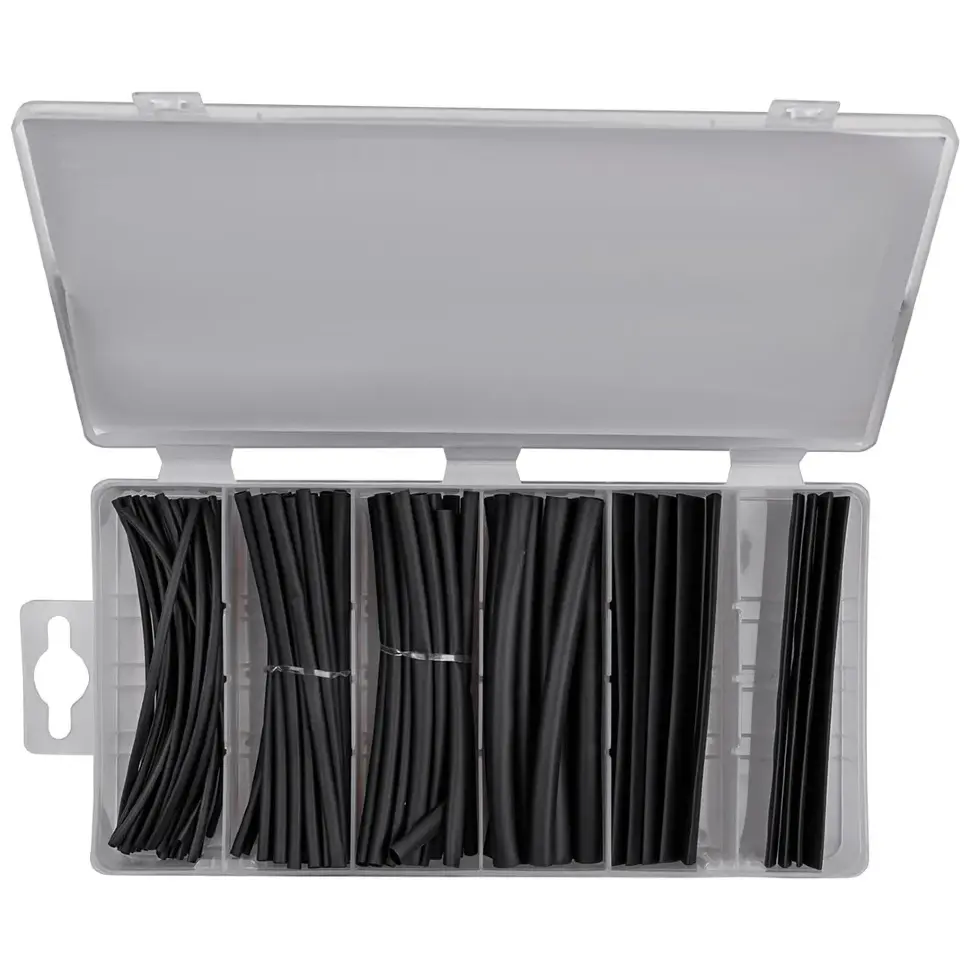 В набор входят трубки чёрного цвета длиной 100 мм, с диаметрами от 1,5 мм до 13 мм, что позволяет использовать их для проводов различного сечения. Изготовлены из термоусадочного полиолефина, устойчивого к воздействию влаги, масел, механическим повреждениям и перепадам температур. При нагреве трубки плотно облегают провод, обеспечивая надёжную изоляцию и аккуратный внешний вид. Упакованы в пластиковый контейнер с секциями по размерам.