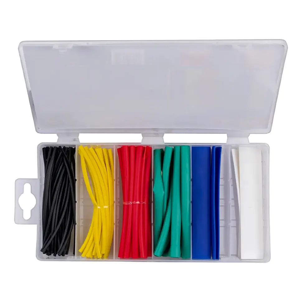 В набор входят трубки длиной 100 мм с диаметрами от 1,5 мм до 13 мм, выполненные в различных цветах для удобства идентификации. Изготовлены из термоусадочного полиолефина, устойчивого к влаге, маслам, механическим повреждениям и перепадам температур. При нагреве трубки плотно облегают провод, обеспечивая надёжную изоляцию и аккуратный внешний вид. Упакованы в пластиковый контейнер с секциями по размерам.