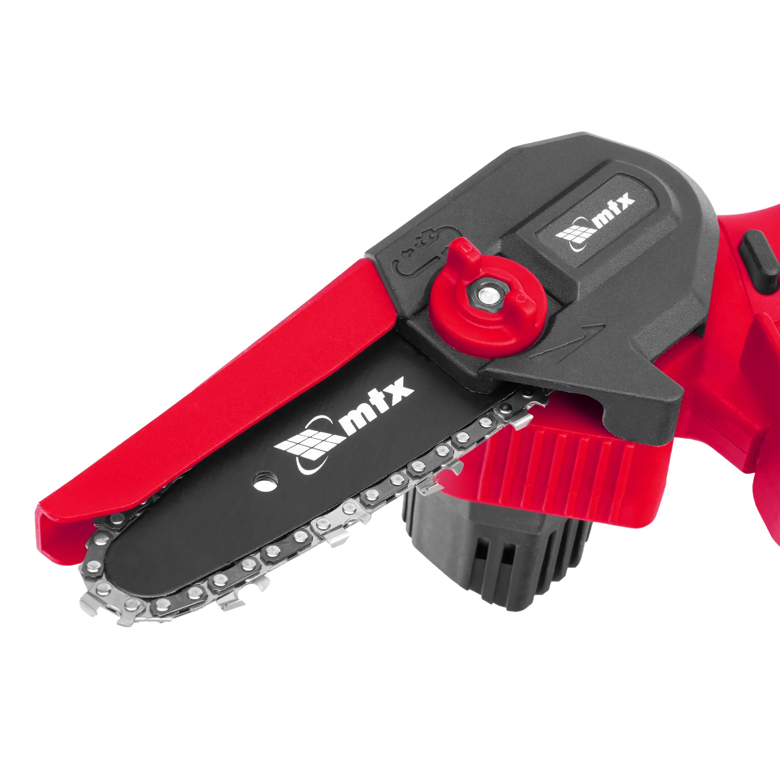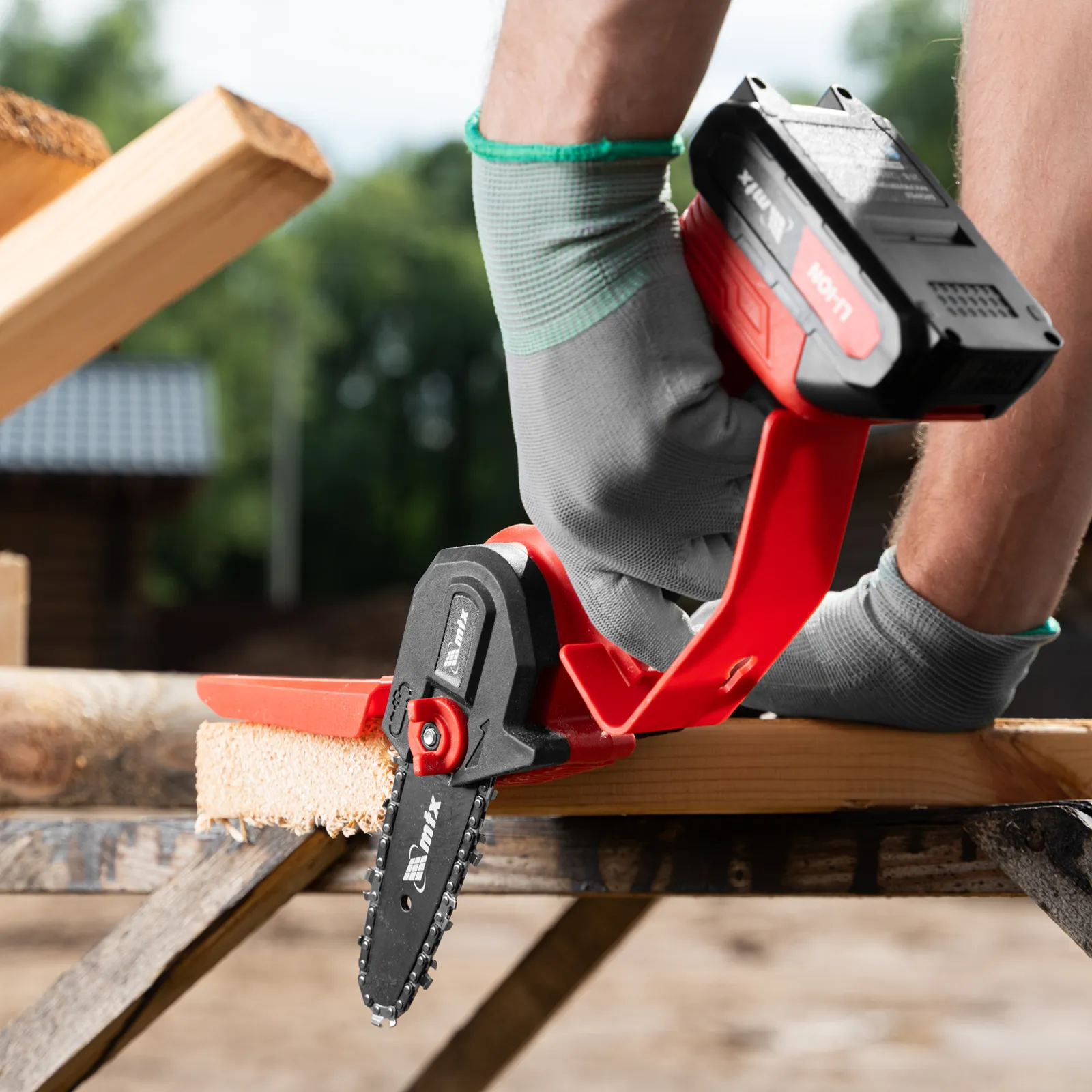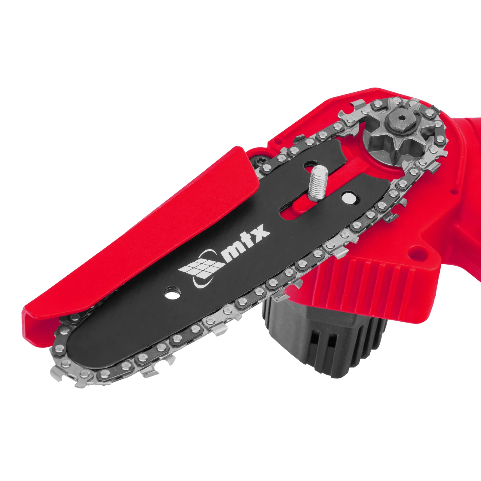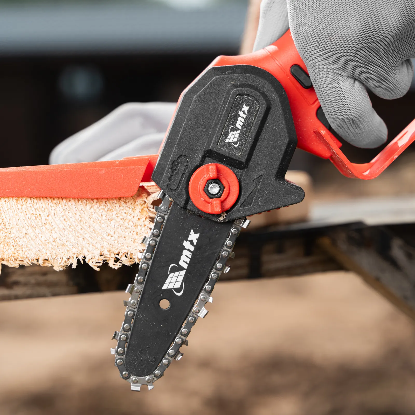 Аккумуляторная цепная мини-пила MTX MCS-100 с шиной длиной 100 мм предназначена для отпиливания веток и сучков, а также пиления бруса толщиной до 100 мм. Работает от аккумулятора Li-Ion 20 В емкостью 2 А·ч, пригодится для работы на садовом участке и в мастерской, также пилу удобно брать на выездные работы.