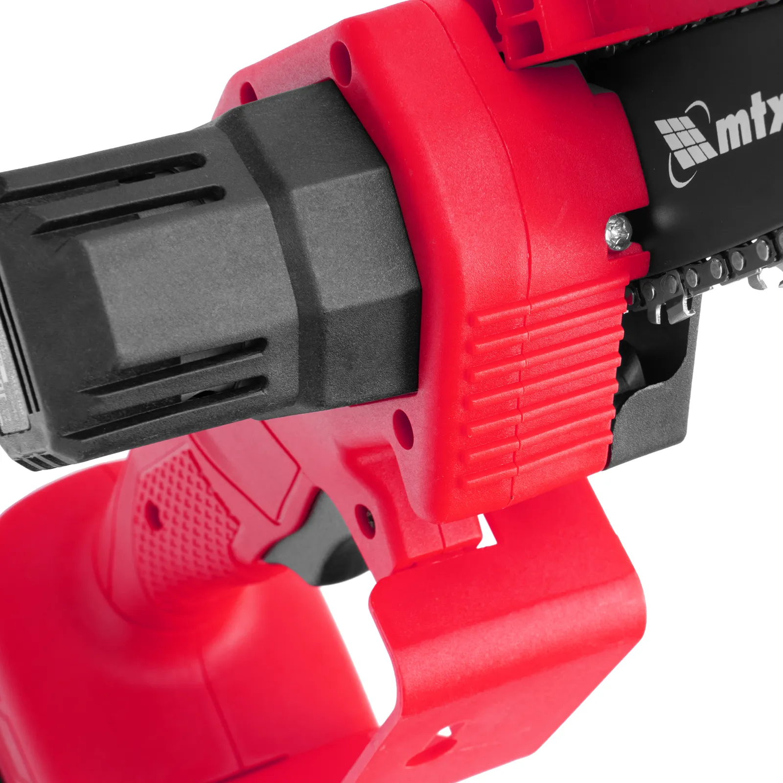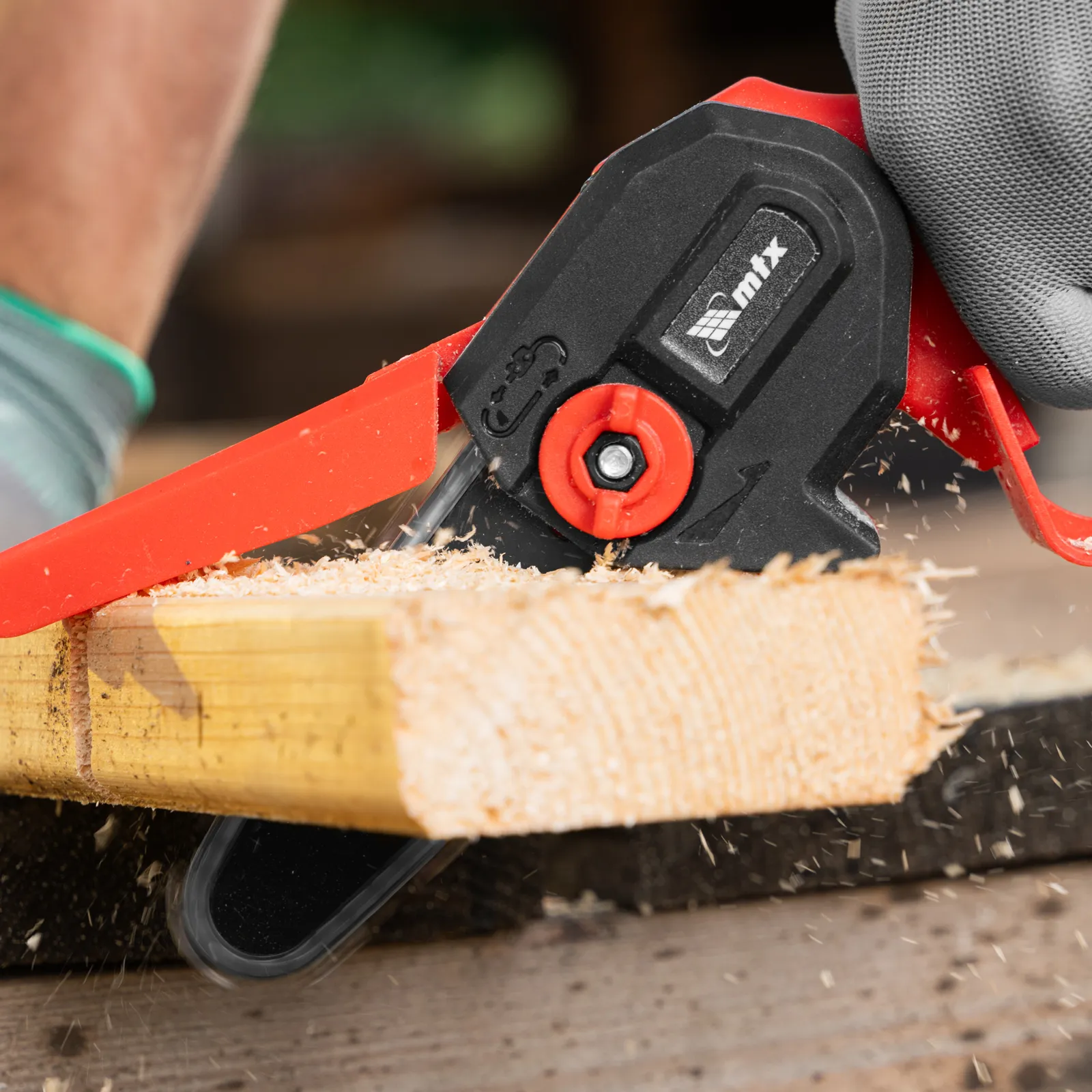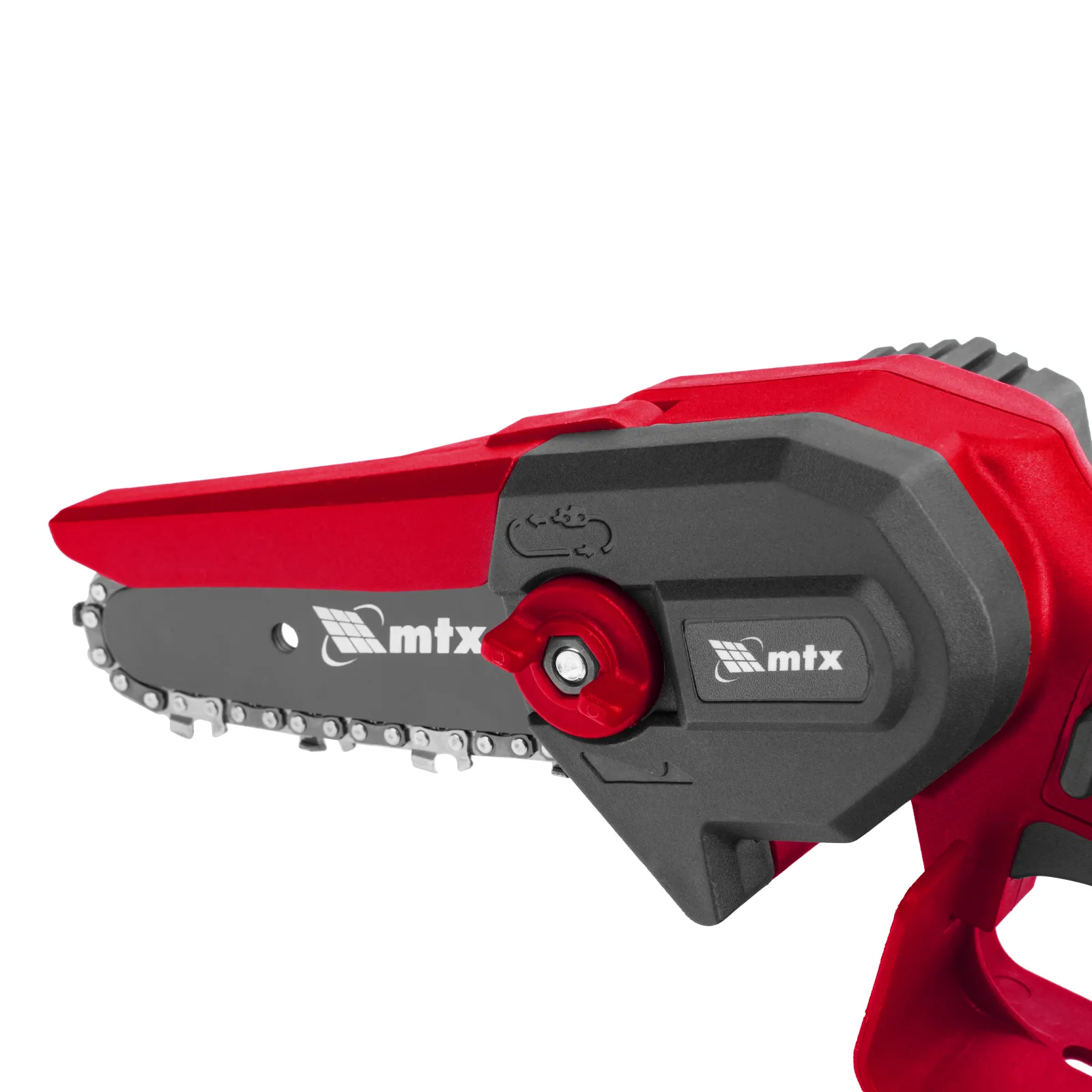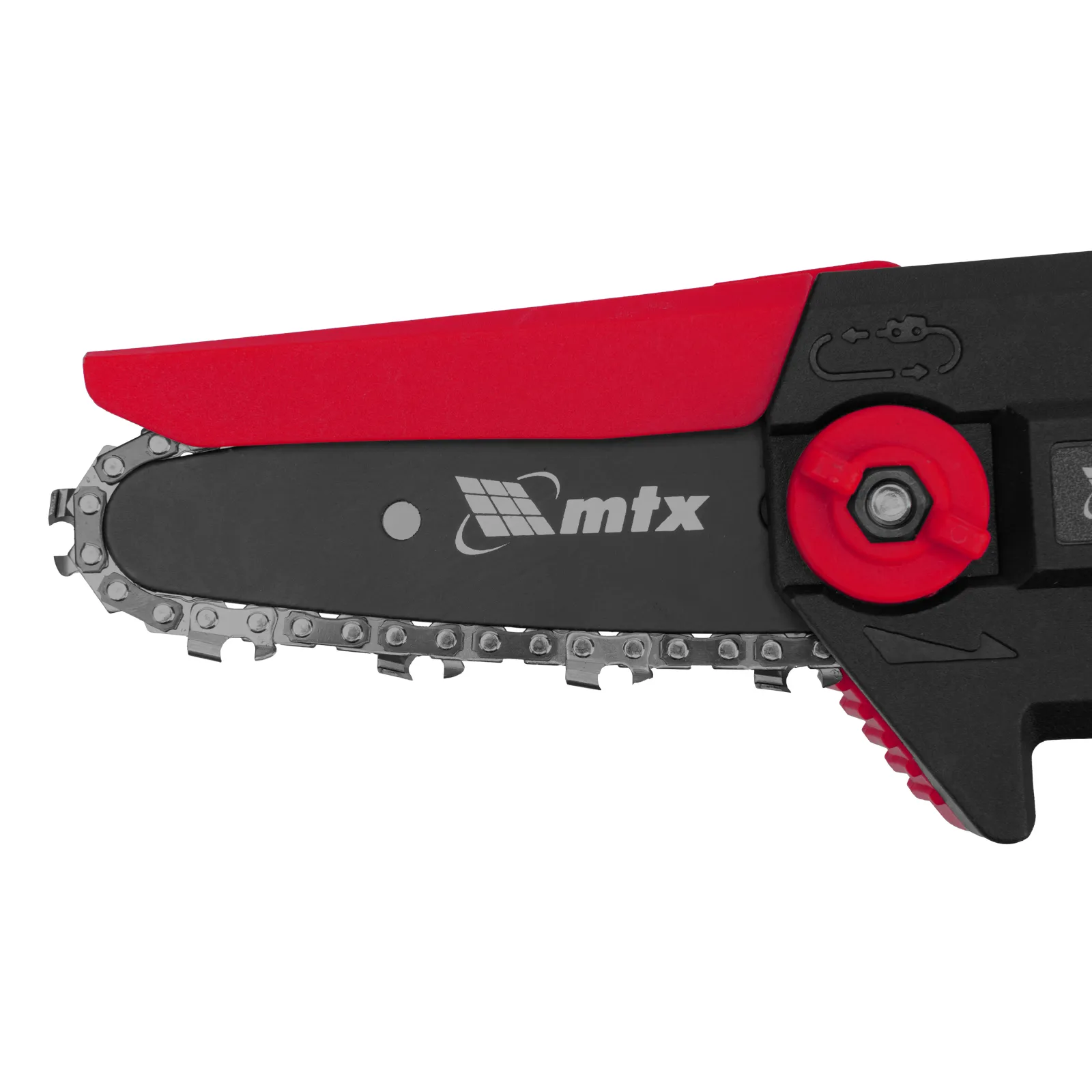 Аккумуляторная цепная мини-пила MTX MCS-100 с шиной длиной 100 мм предназначена для отпиливания веток и сучков, а также пиления бруса толщиной до 100 мм. Работает от аккумулятора Li-Ion 20 В емкостью 2 А·ч, пригодится для работы на садовом участке и в мастерской, также пилу удобно брать на выездные работы.