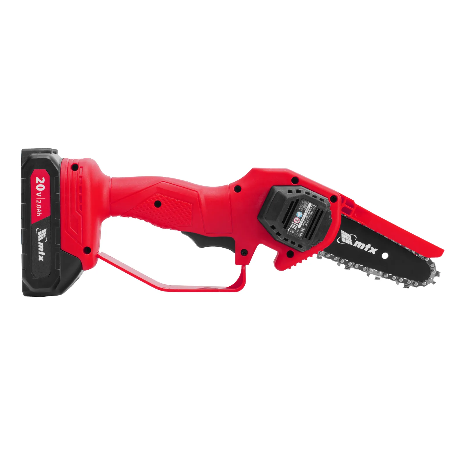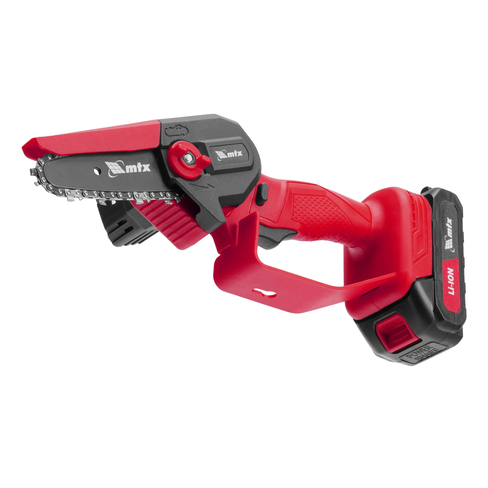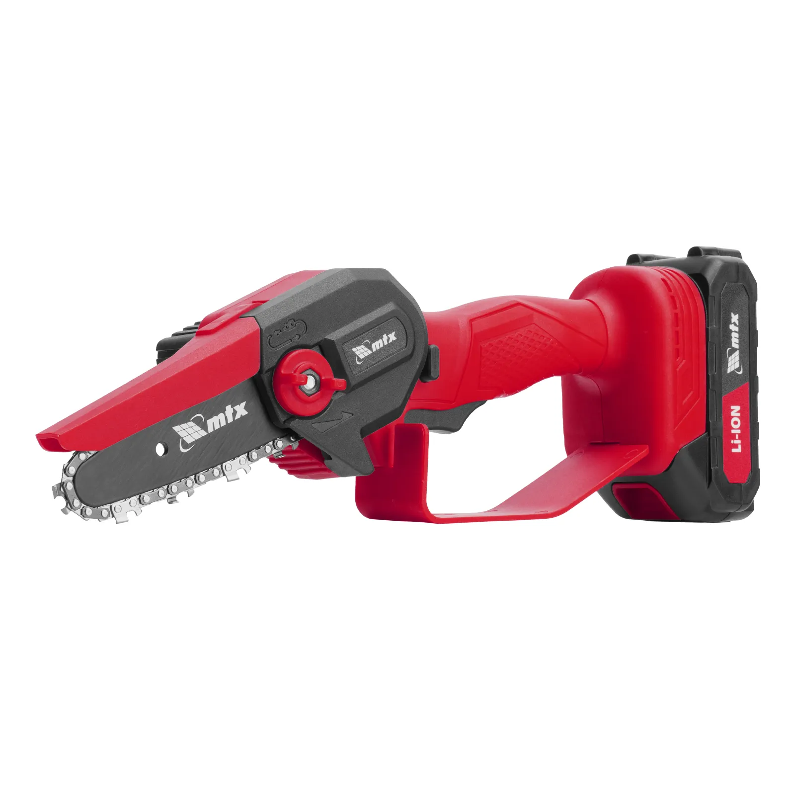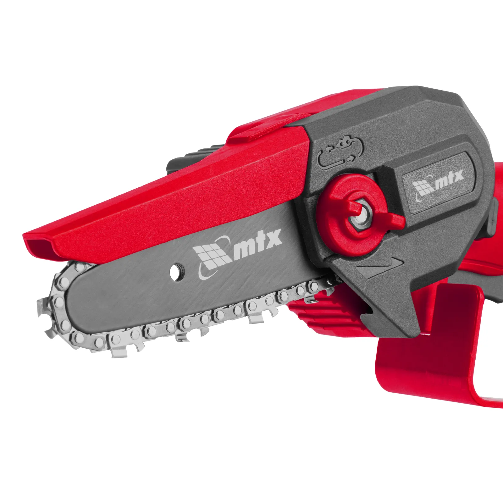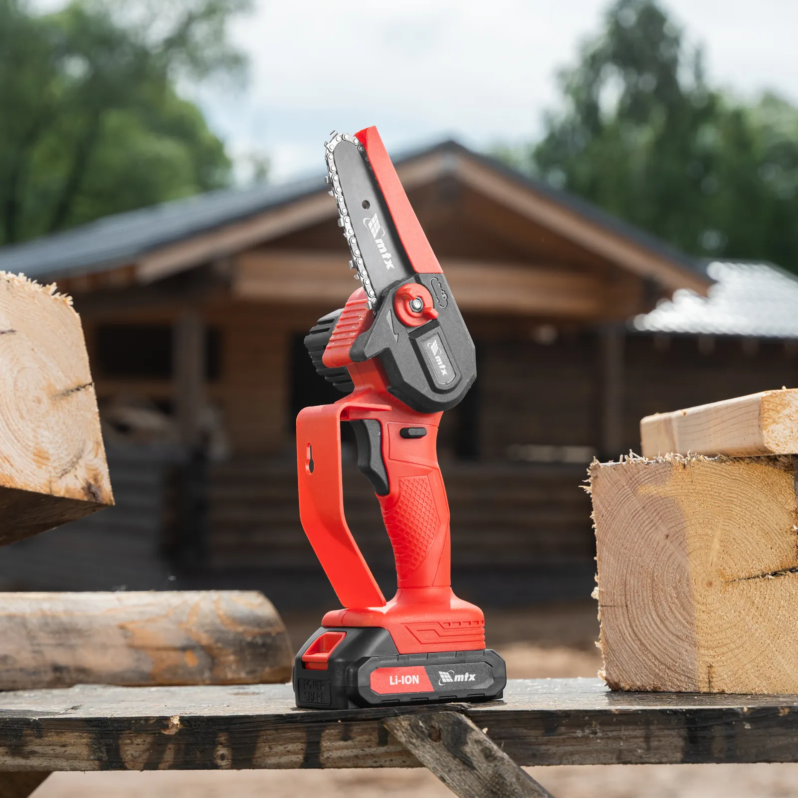 Аккумуляторная цепная мини-пила MTX MCS-100 с шиной длиной 100 мм предназначена для отпиливания веток и сучков, а также пиления бруса толщиной до 100 мм. Работает от аккумулятора Li-Ion 20 В емкостью 2 А·ч, пригодится для работы на садовом участке и в мастерской, также пилу удобно брать на выездные работы.
