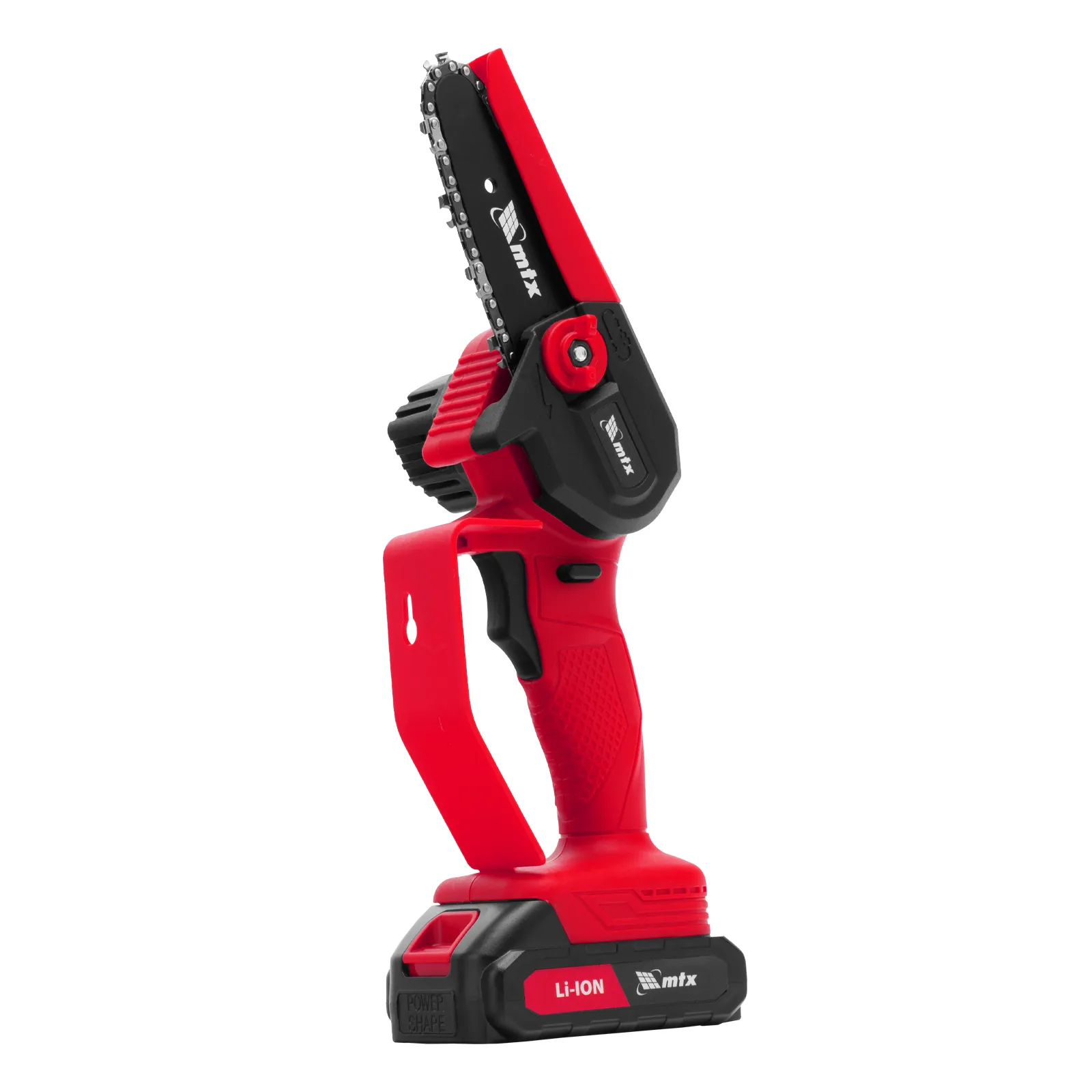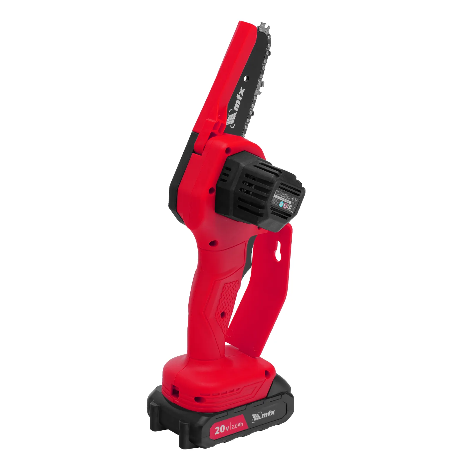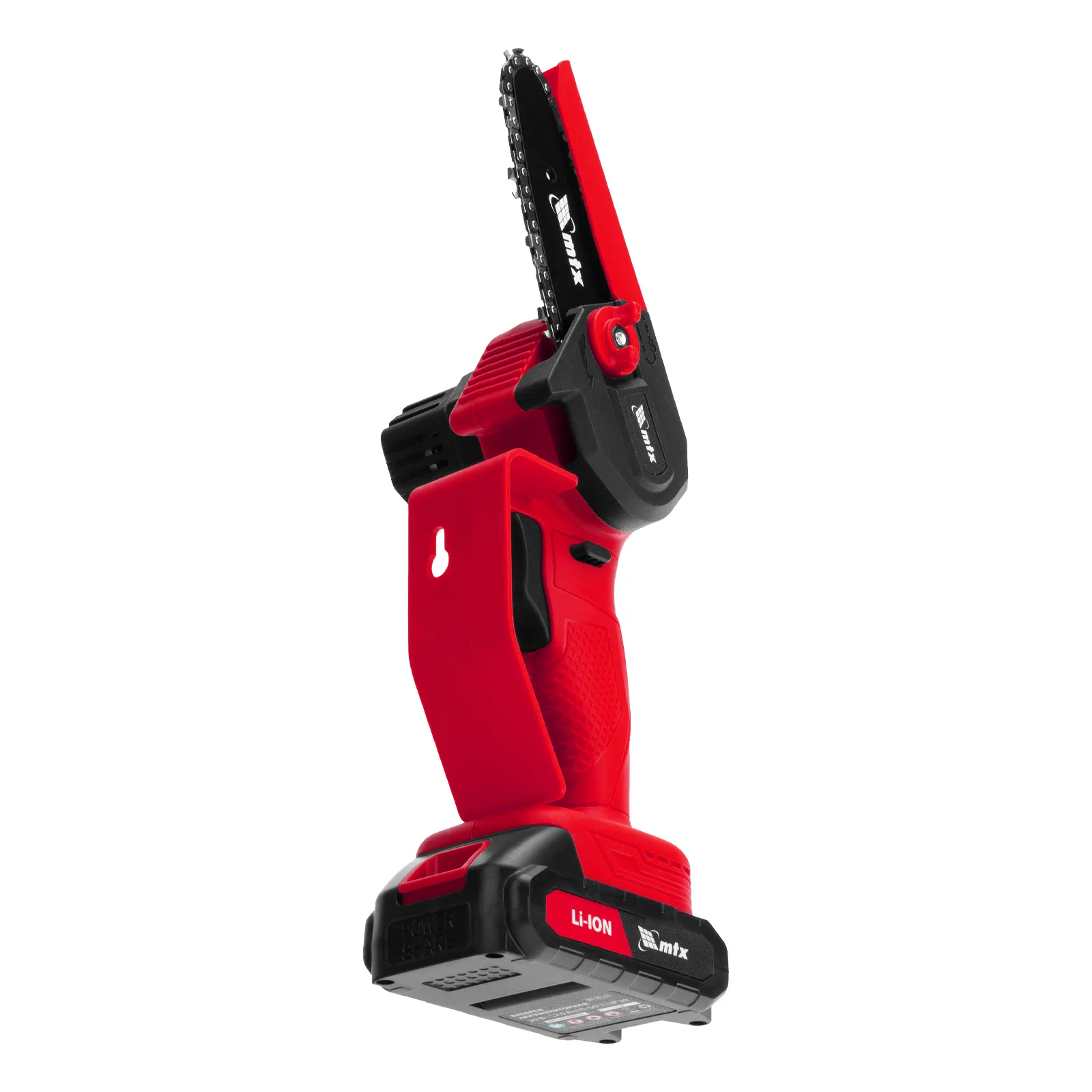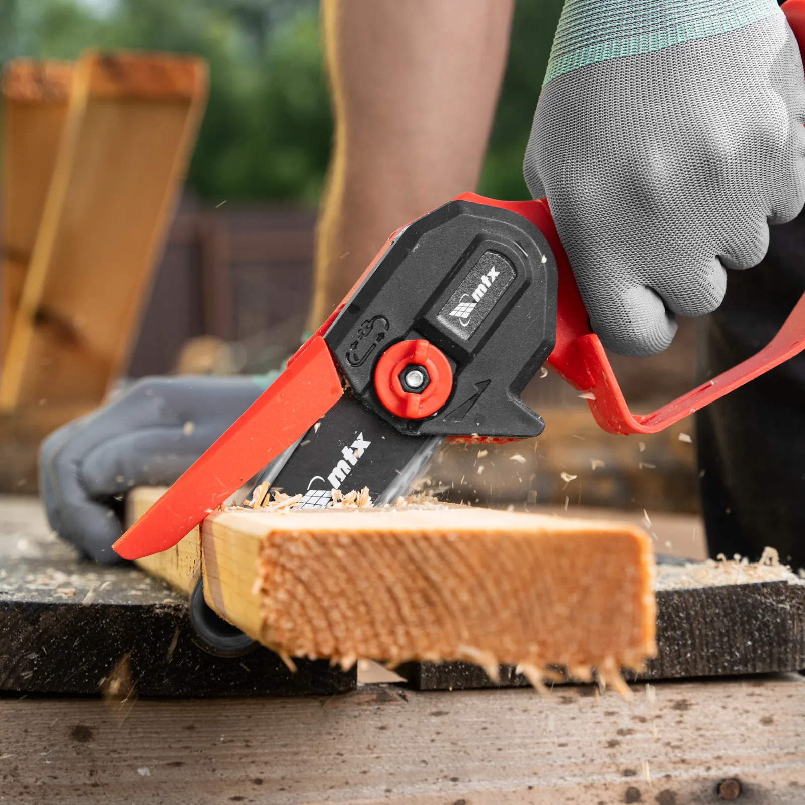 Аккумуляторная цепная мини-пила MTX MCS-100 с шиной длиной 100 мм предназначена для отпиливания веток и сучков, а также пиления бруса толщиной до 100 мм. Работает от аккумулятора Li-Ion 20 В емкостью 2 А·ч, пригодится для работы на садовом участке и в мастерской, также пилу удобно брать на выездные работы.