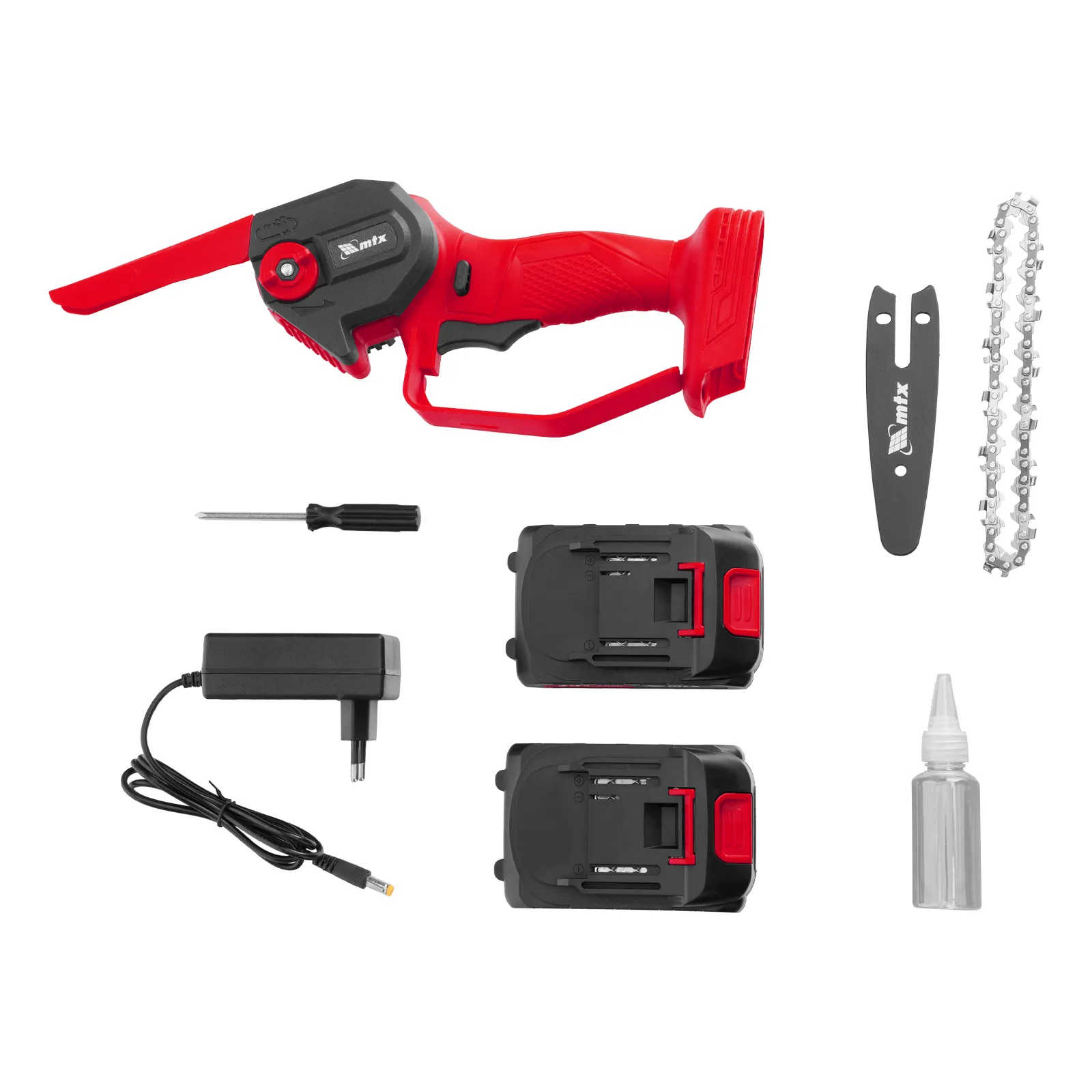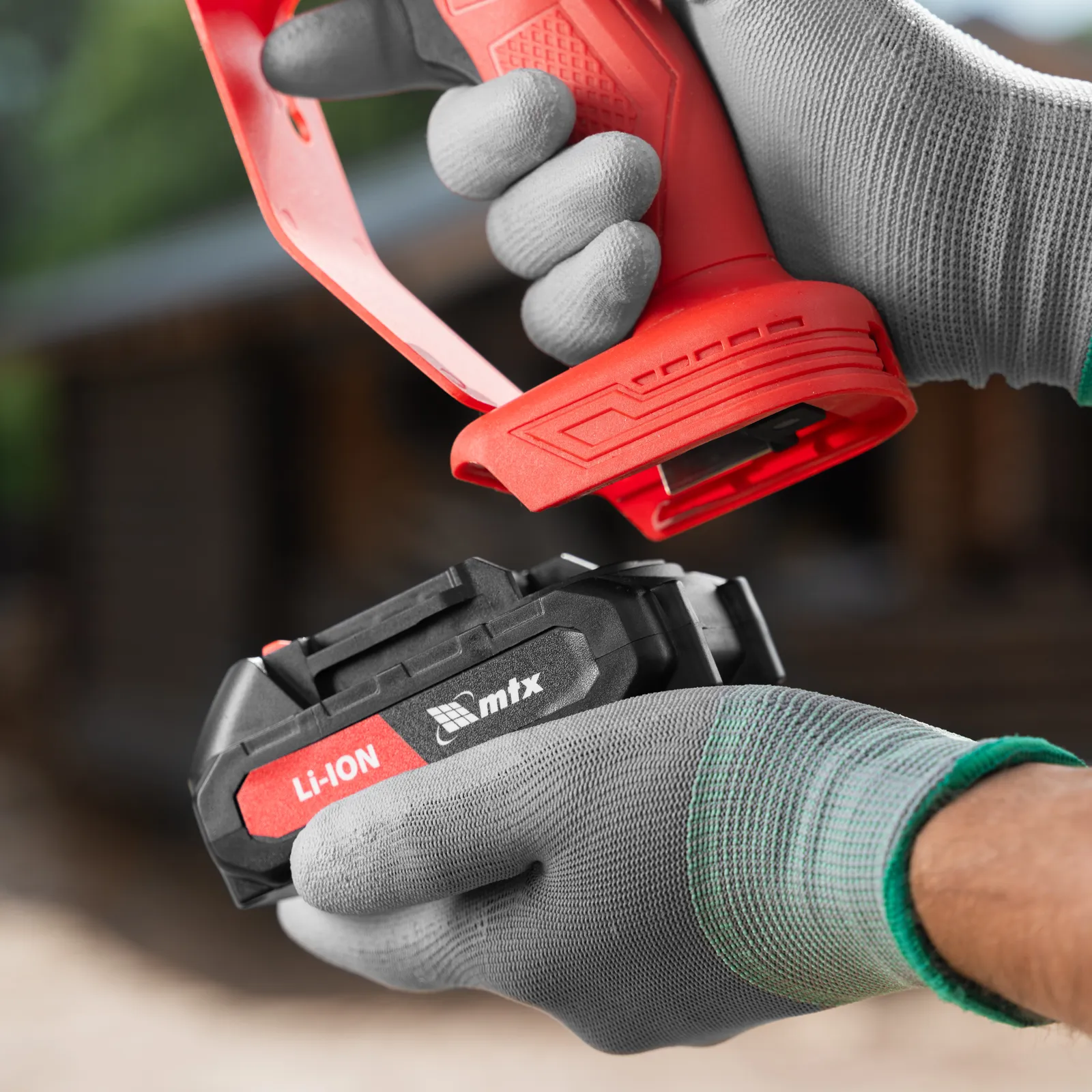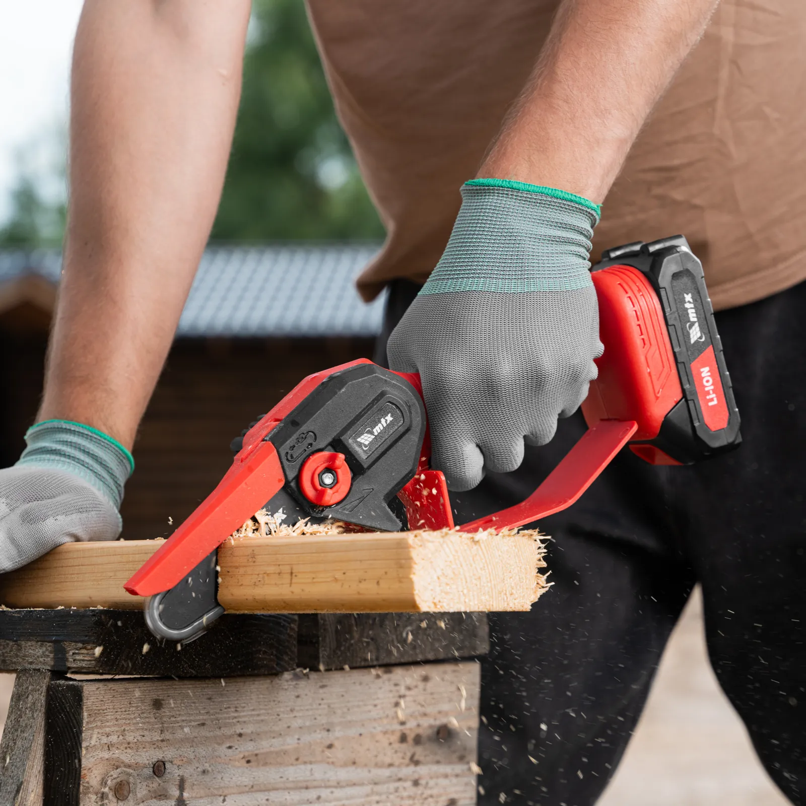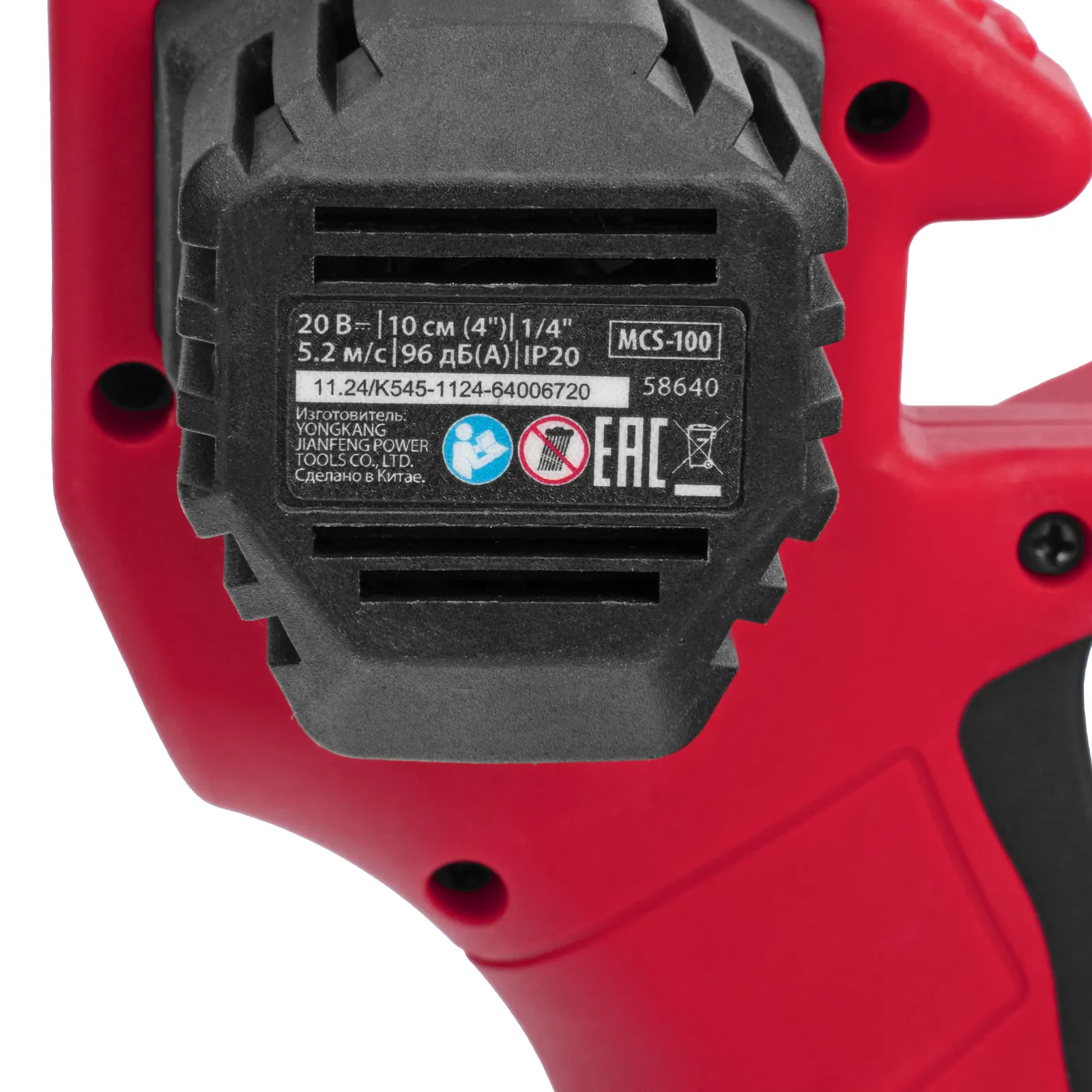 Аккумуляторная цепная мини-пила MTX MCS-100 с шиной длиной 100 мм предназначена для отпиливания веток и сучков, а также пиления бруса толщиной до 100 мм. Работает от аккумулятора Li-Ion 20 В емкостью 2 А·ч, пригодится для работы на садовом участке и в мастерской, также пилу удобно брать на выездные работы.