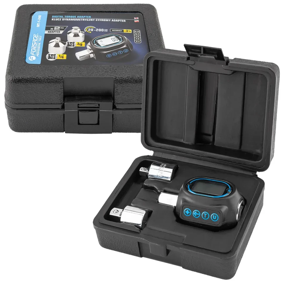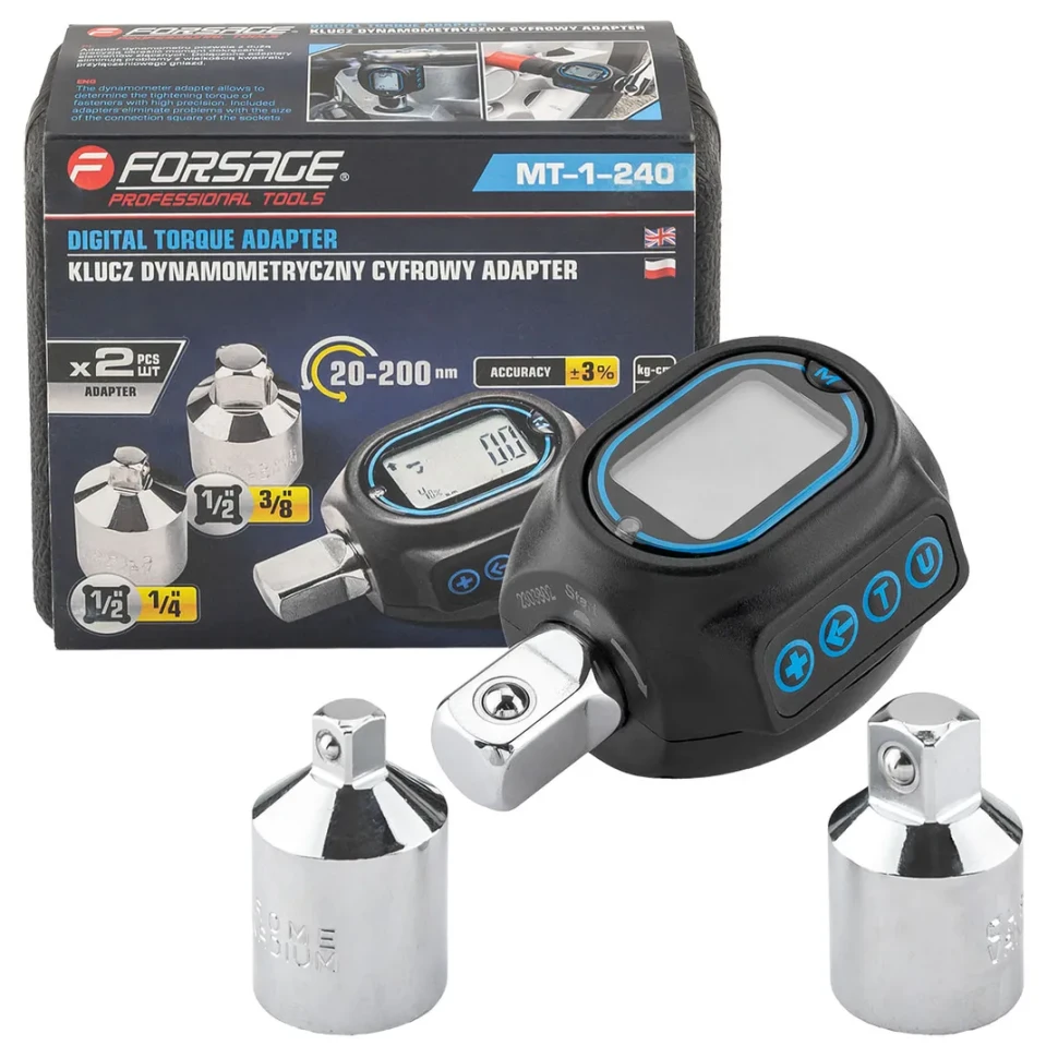 Цифровой адаптер крутящего момента Forsage F-MT-1-240 предназначен для измерения и контроля крутящего момента при работе с крепежными соединениями. Устанавливается между трещоткой или воротком и торцевой головкой, позволяя точно задавать и отслеживать момент затяжки.
