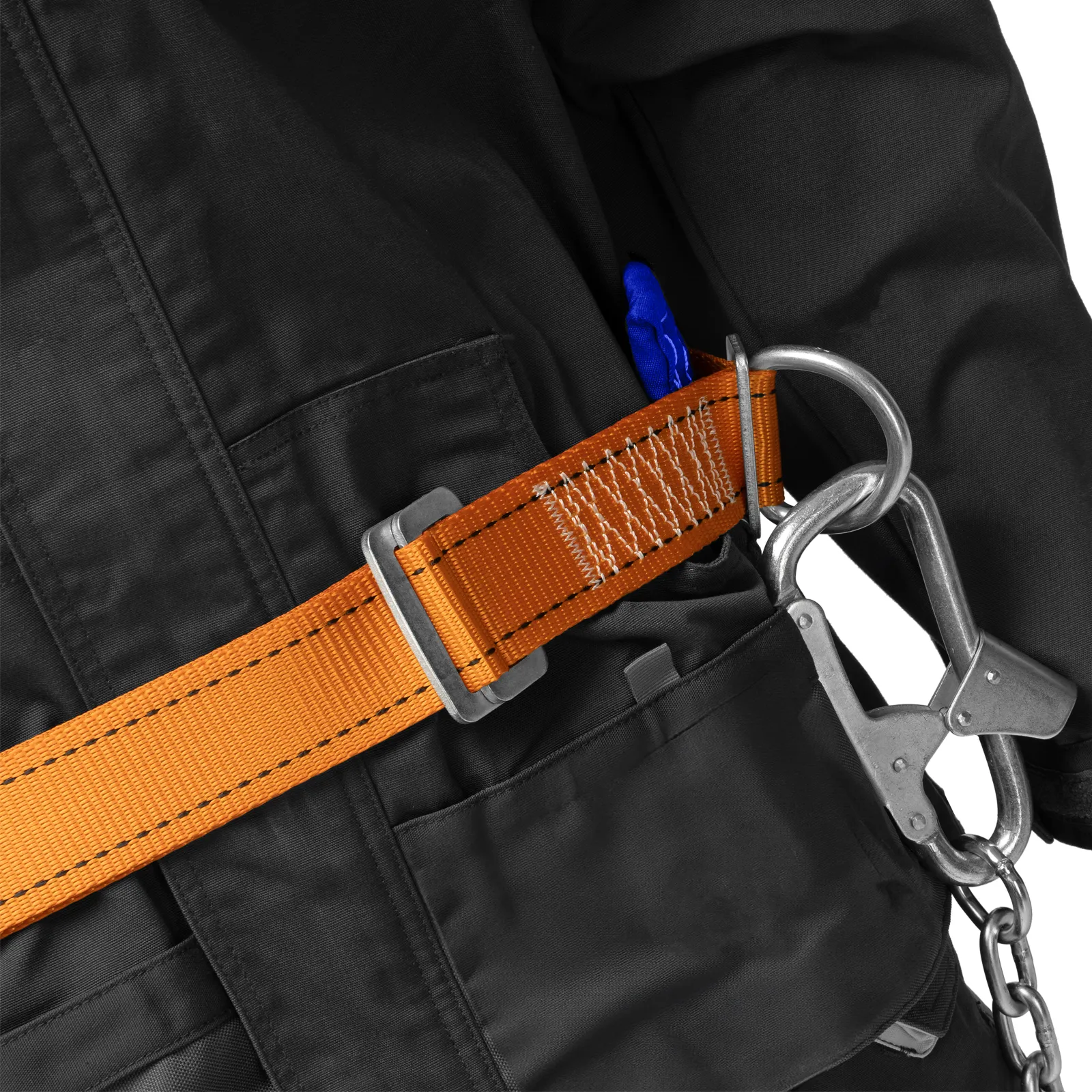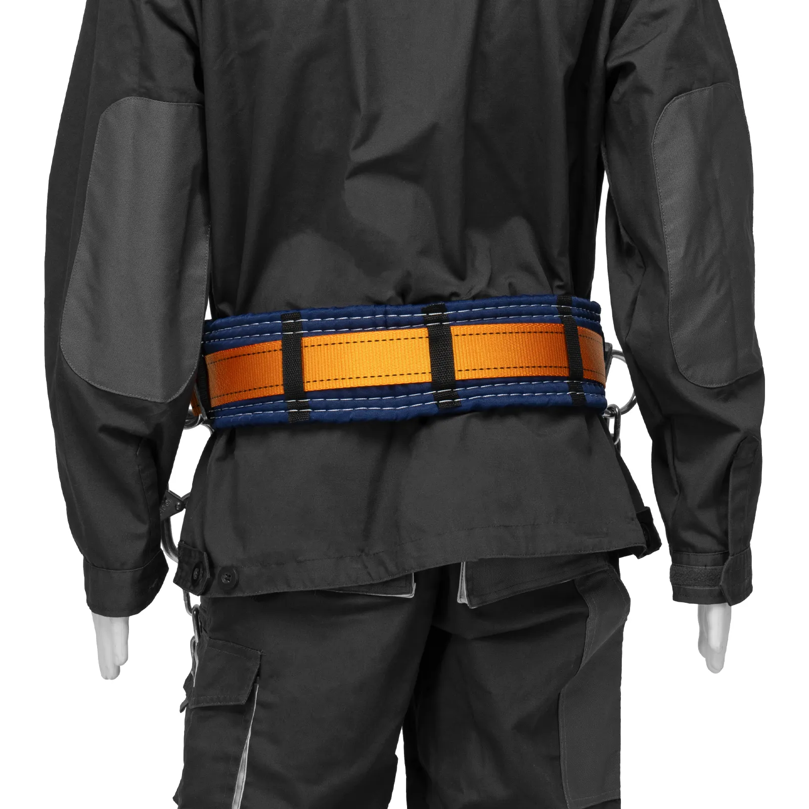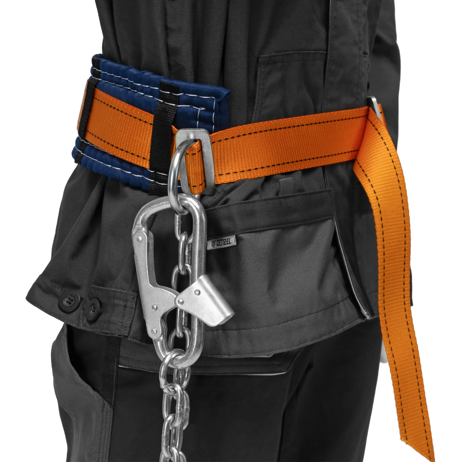 Надежное удержание пользователя обеспечивают большой монтажный карабин и 2 металлических D-кольца в конструкции удерживающей привязи.
