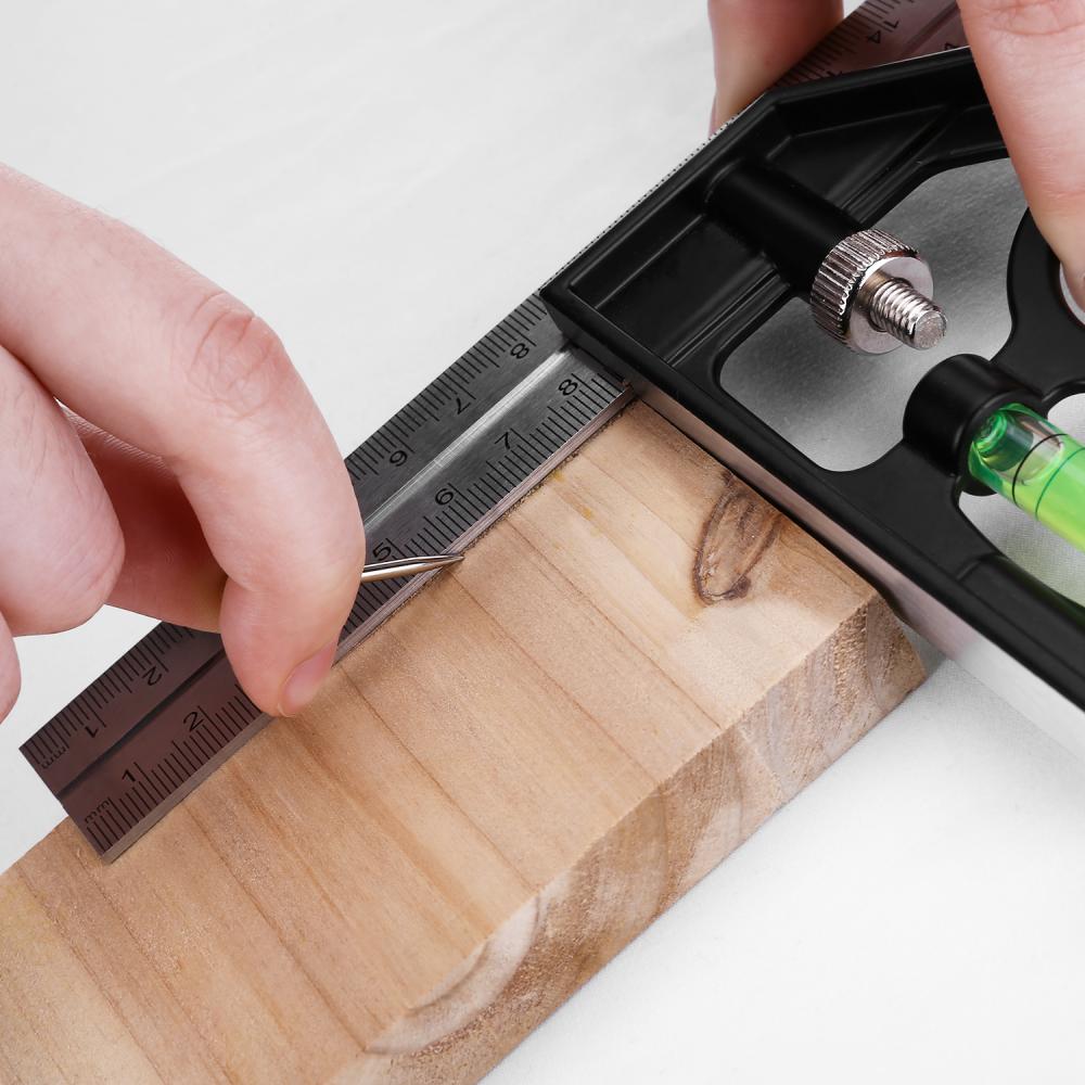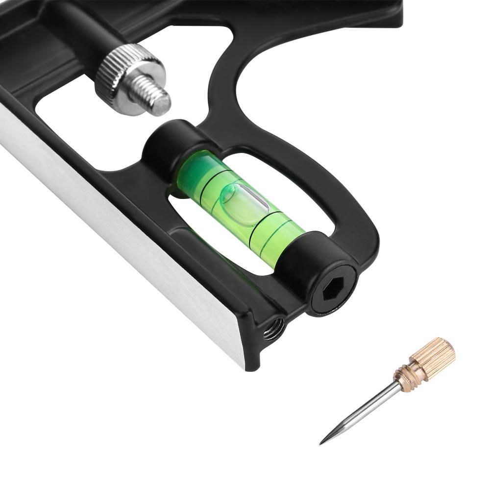 - На линейке выгравированная шкала с двух сторон. Угольник оснащен пузырьковой ампулой и чертилкой для нанесения рисок на размечаемую поверхность. Возможна замена измерительного полотна (линейки) благодаря юстировочному винту.