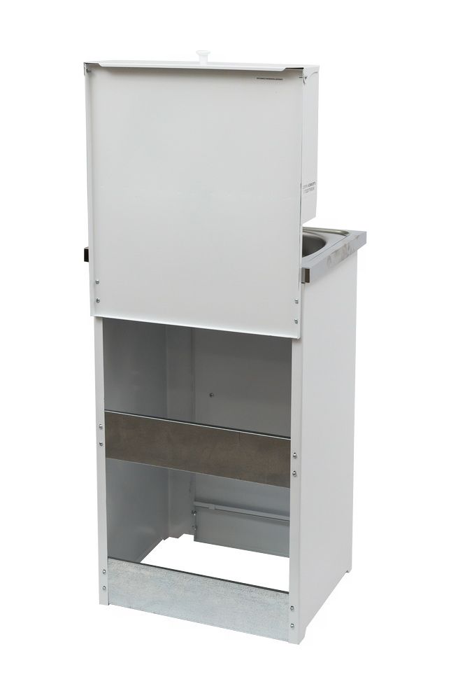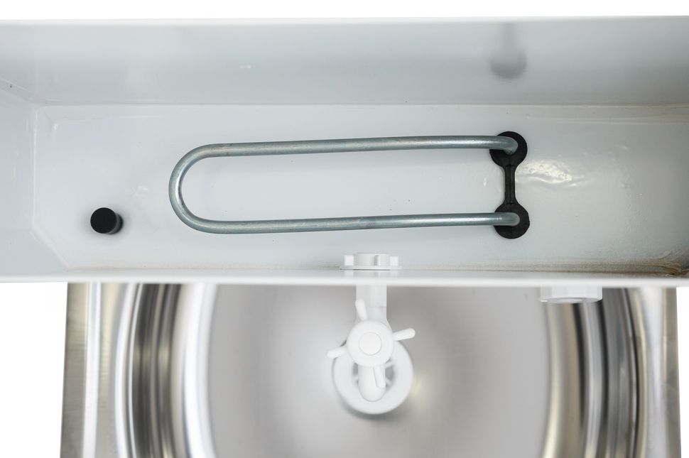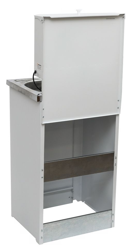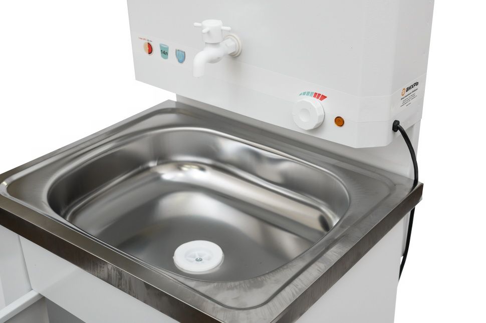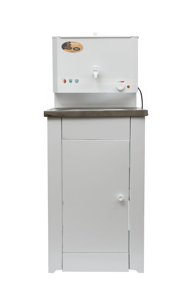 - Принцип работы умывальника прост. В верхней части находится емкость, которую наполняют водой. В данной модели есть подогрев, мощность устройства 1,3 кВт, что позволит быстро получить теплую воду, необходимо только подключить умывальник в розетку 220 В. В нижней части за дверкой располагают ведро или присоединяют сливной шланг. Слив воды аккуратно скрыт от посторонних глаз, а помещение с таким умывальником выглядит опрятно.