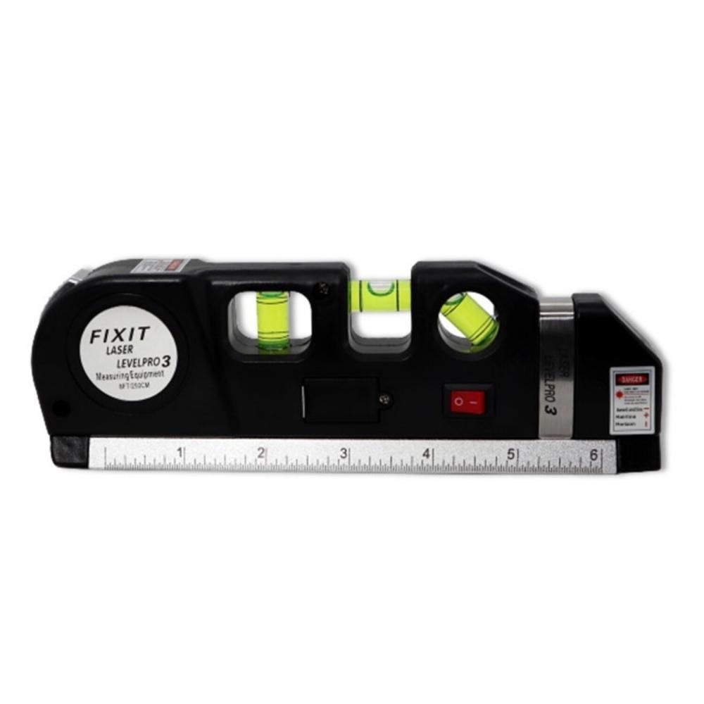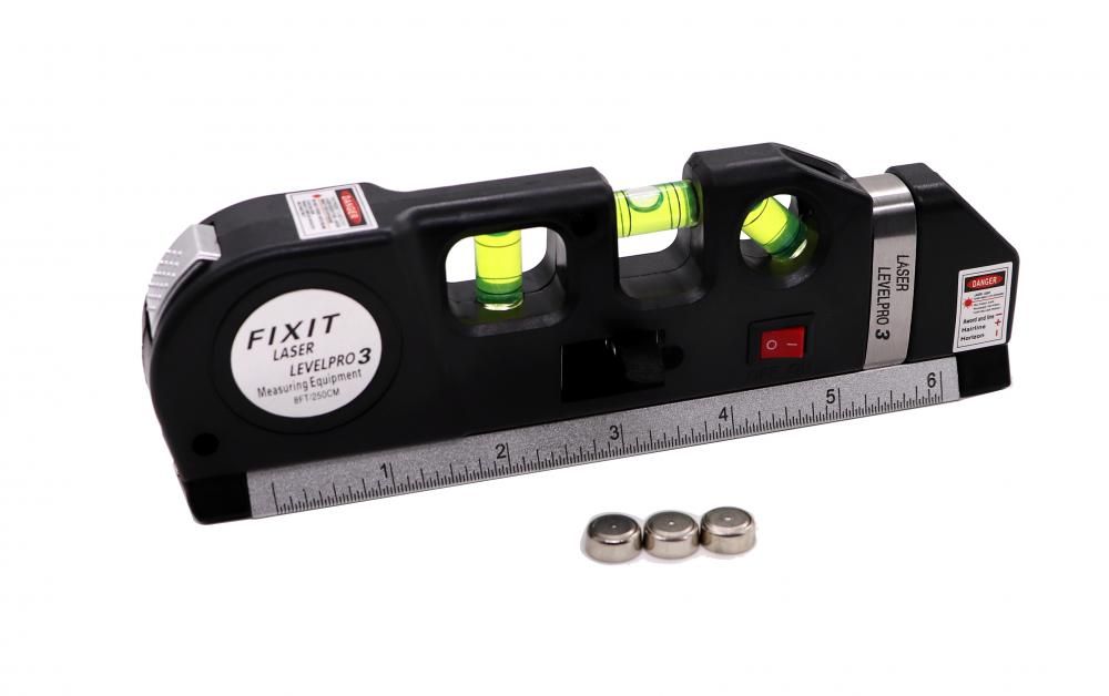 - Имеет три пузырьковых уровня, рулетку длиной 250 см, линейку длиной 15 см.