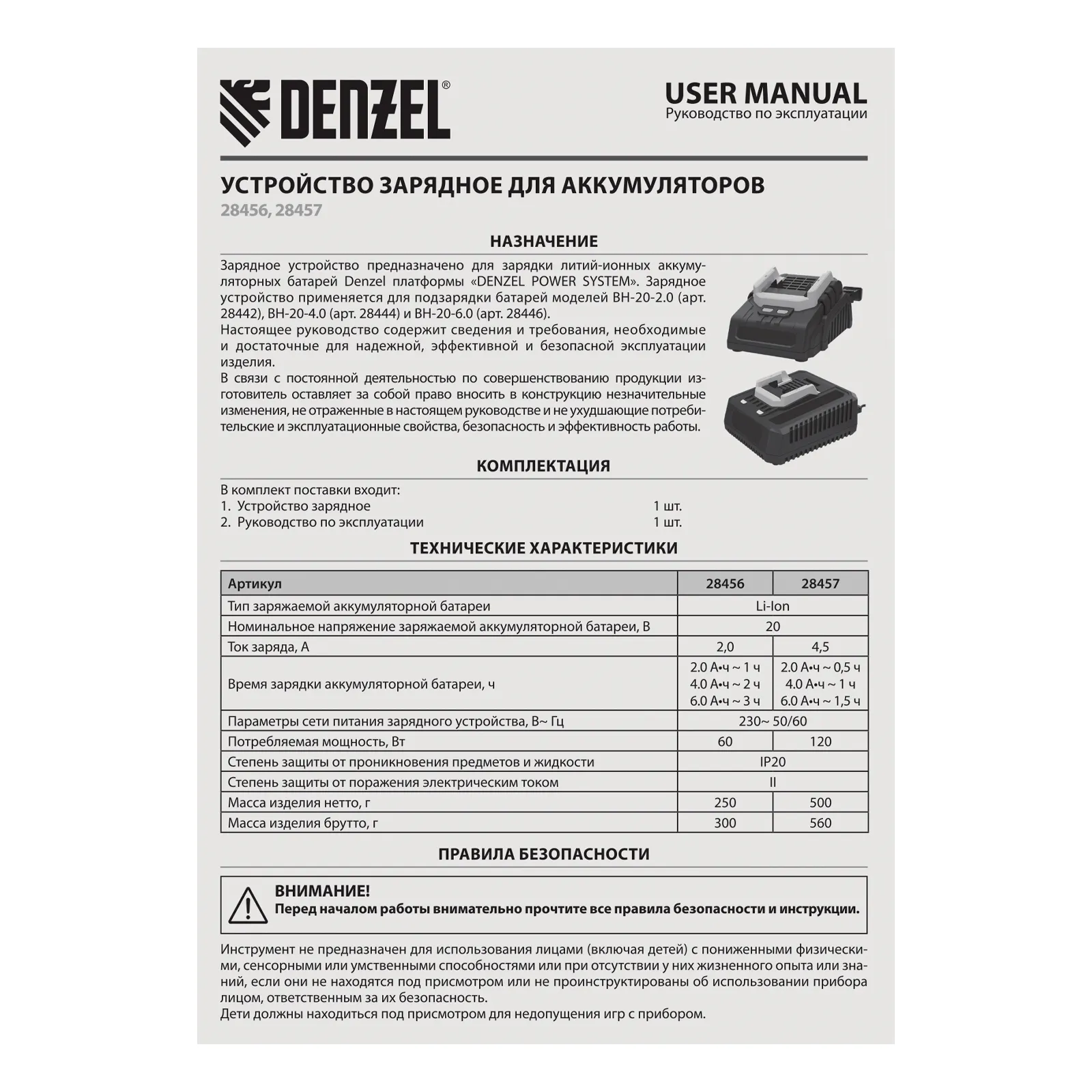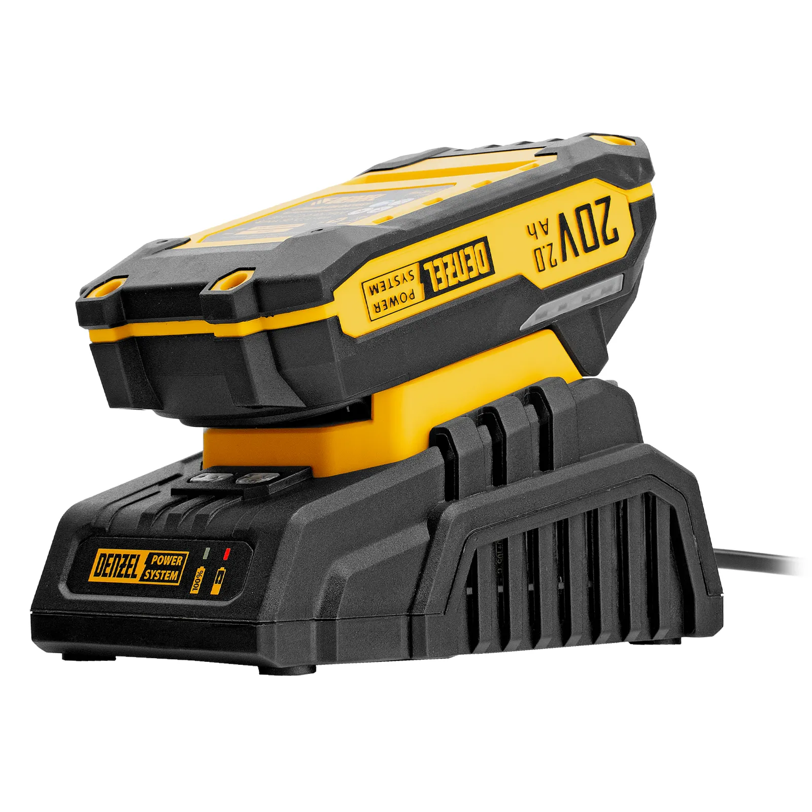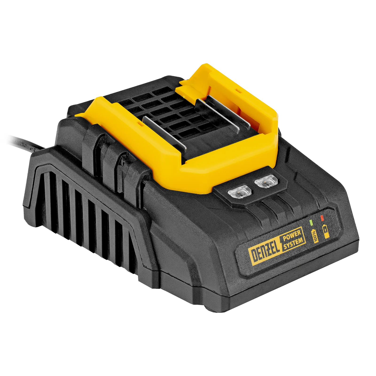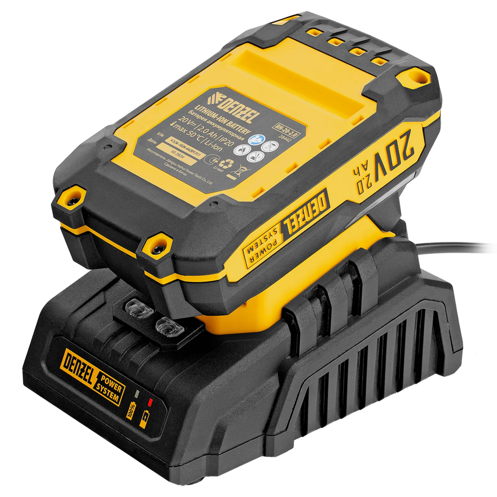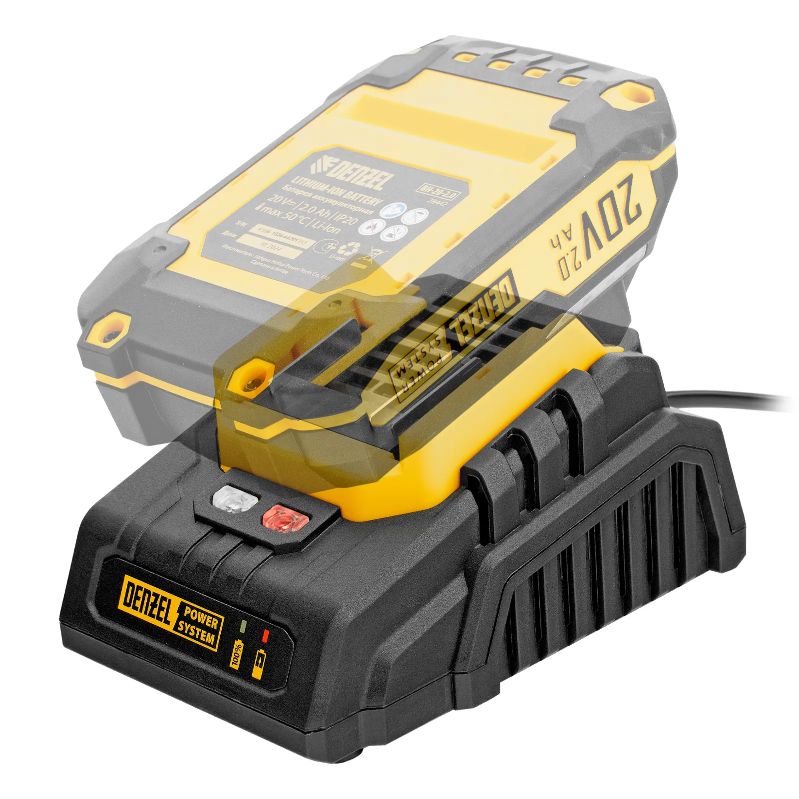 Зарядное устройство Denzel BCH-20-2.0 поддерживает ток заряда 2,0 A и предназначено для восстановления работоспособности аккумуляторов Denzel Li-Ion 20 В (артикулы 28442, 28444 и 28446). Обеспечивает быструю и полную зарядку, что позволяет избежать длительных перерывов в работе с аккумуляторным инструментом.