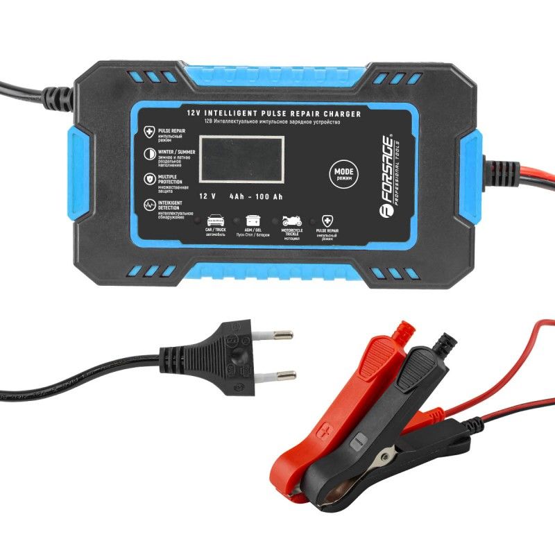 Автоматическое зарядное устройство для автомобильных аккумуляторов 12В от бренда Forsage с функцией импульсного восстановления и ремонта сильно разряженных и сульфатированных АКБ, большим ЖК-дисплеем и сенсорным управлением. Яркий экран защищен защитной пленкой от царапин. Универсальное зарядное устройство для аккумуляторов автомобилей имеет 3-х уровневый микропроцессорный контроль зарядного устройства для аккумулятора автомобиля, подходит как для мотоциклов, скутеров, снегоходов, так и для грузовых и водных транспортных средств. Зарядка для автомобильного аккумулятора в машину позволяет восстановить сильно разряженные и сульфатированные АКБ. Зарядник адаптирует напряжение заряда к окружающей температуре. Автоматика защищает процесс заряжания от обратной полярности, искр, короткого замыкания и подключения без батареи, перенапряжения, перегрева и закипания электролита. Интеллектуальное импульсное зарядное устройство с LCD индикатором для свинцово-кислотных аккумуляторов с номинальным напряжением 12 вольт емкос