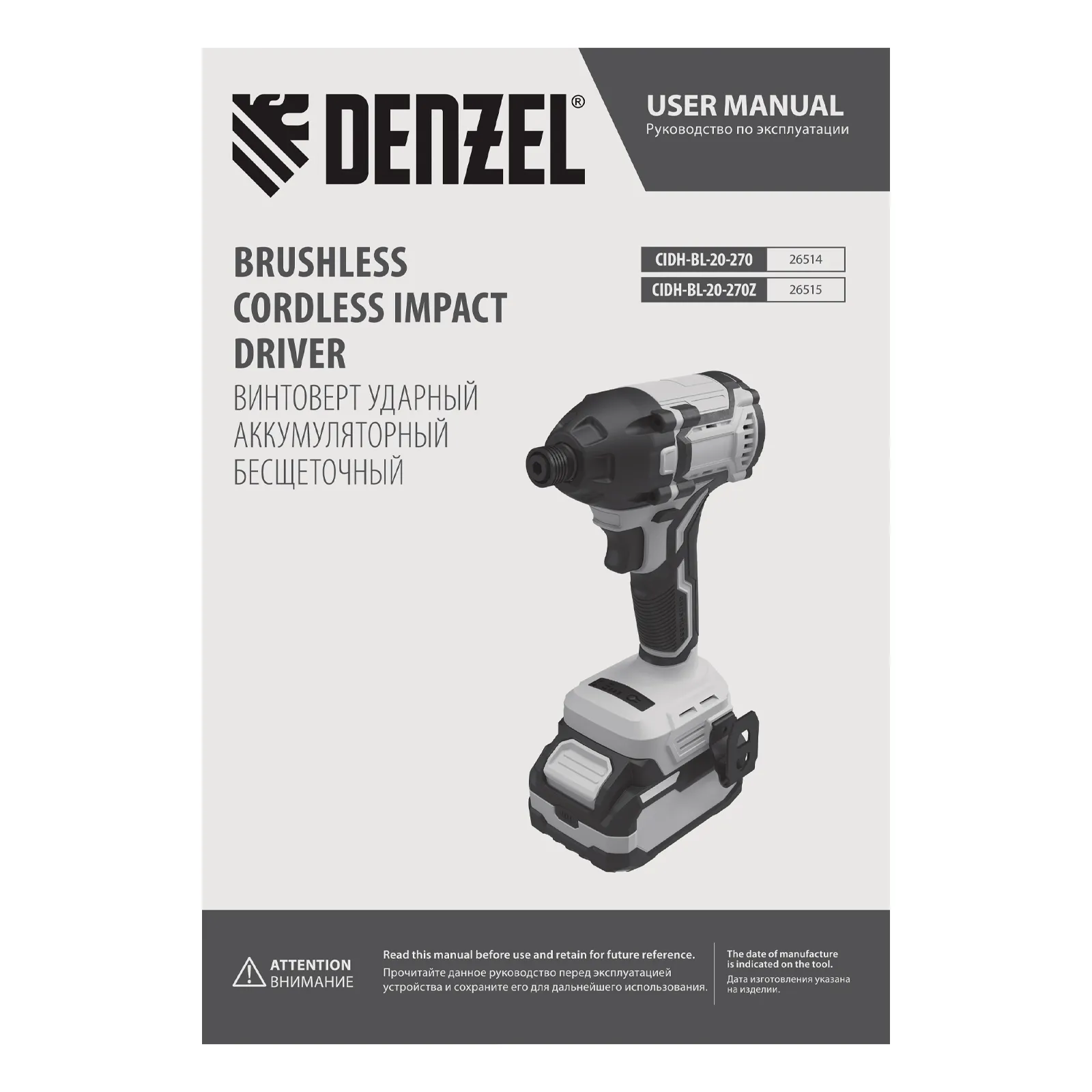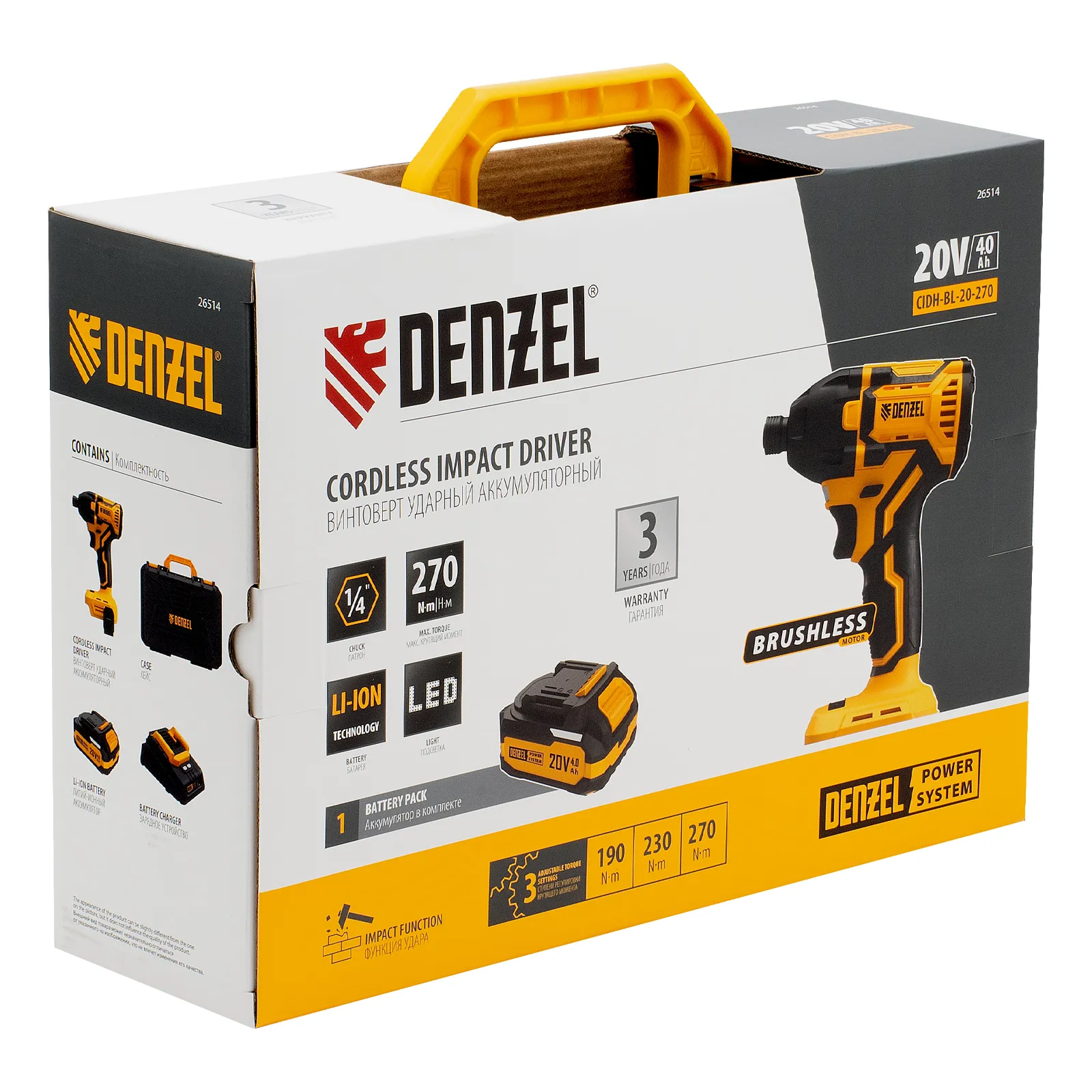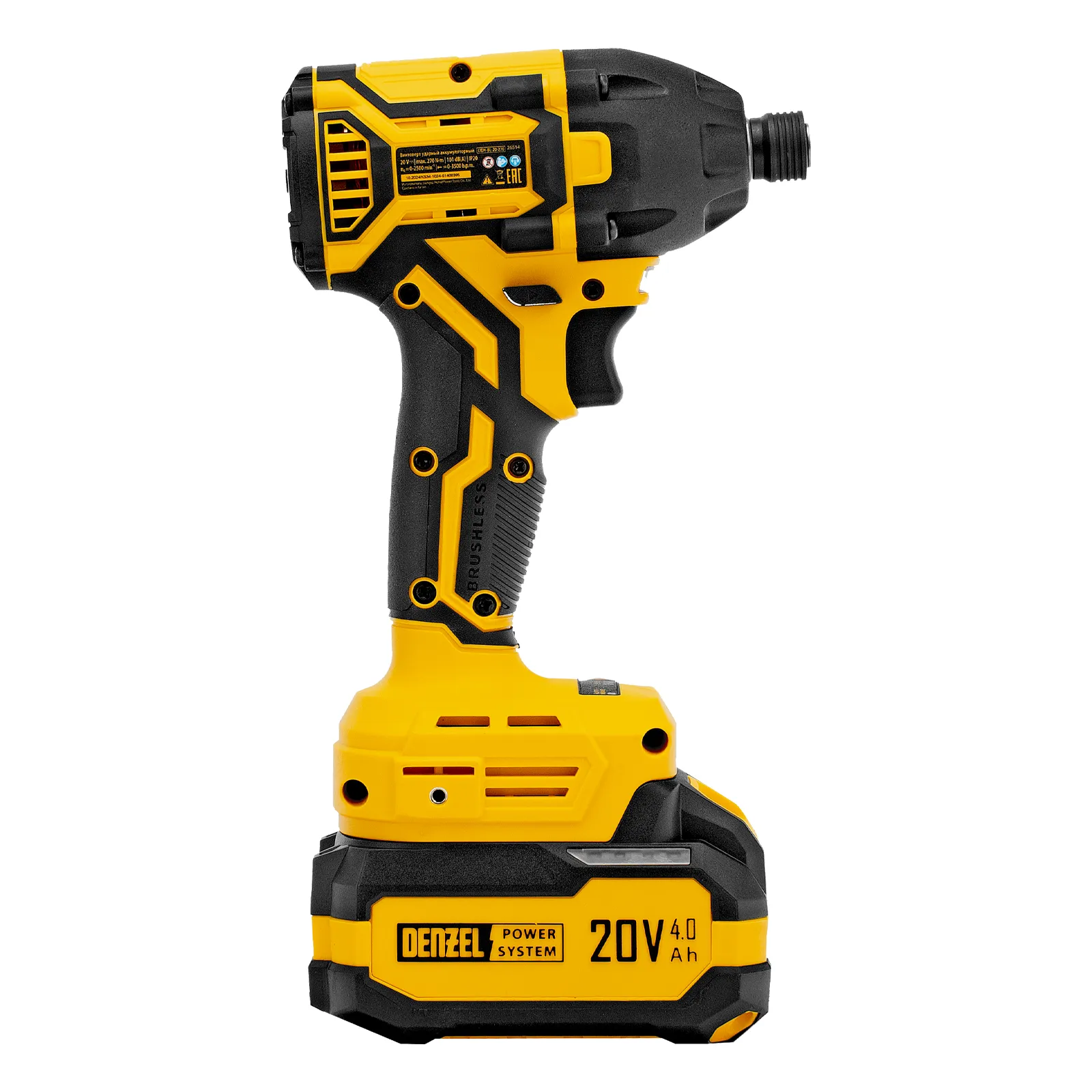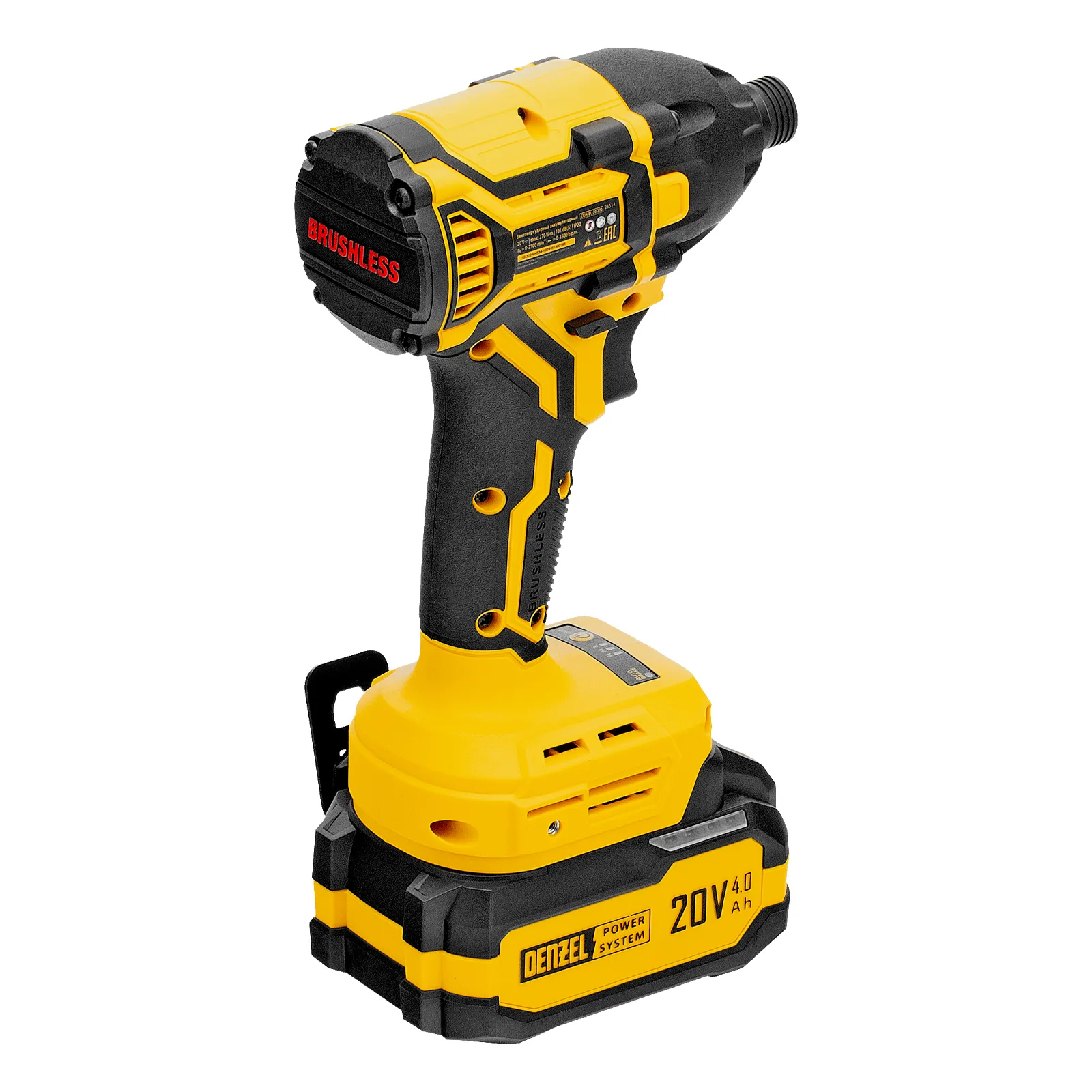 Винтоверт ударный аккумуляторный бесщет. CIDH-BL-20-270, Li-Ion,1/4", 2500 об/мин, 20 В 1АКБ 4,0 А/ч, DENZEL 26514