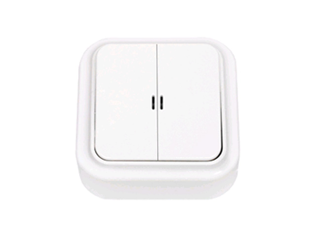 Выключатель белый двухклавишный со световой индикацией открытой установки, 10А, Пралеска BYLECTRICA А5 10-215