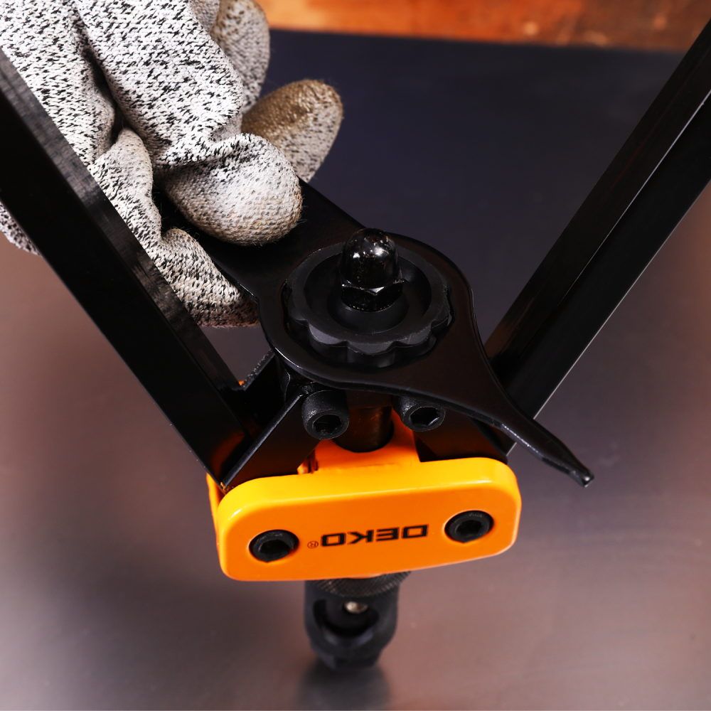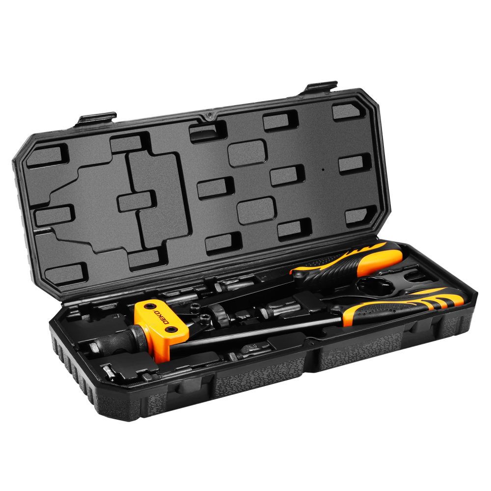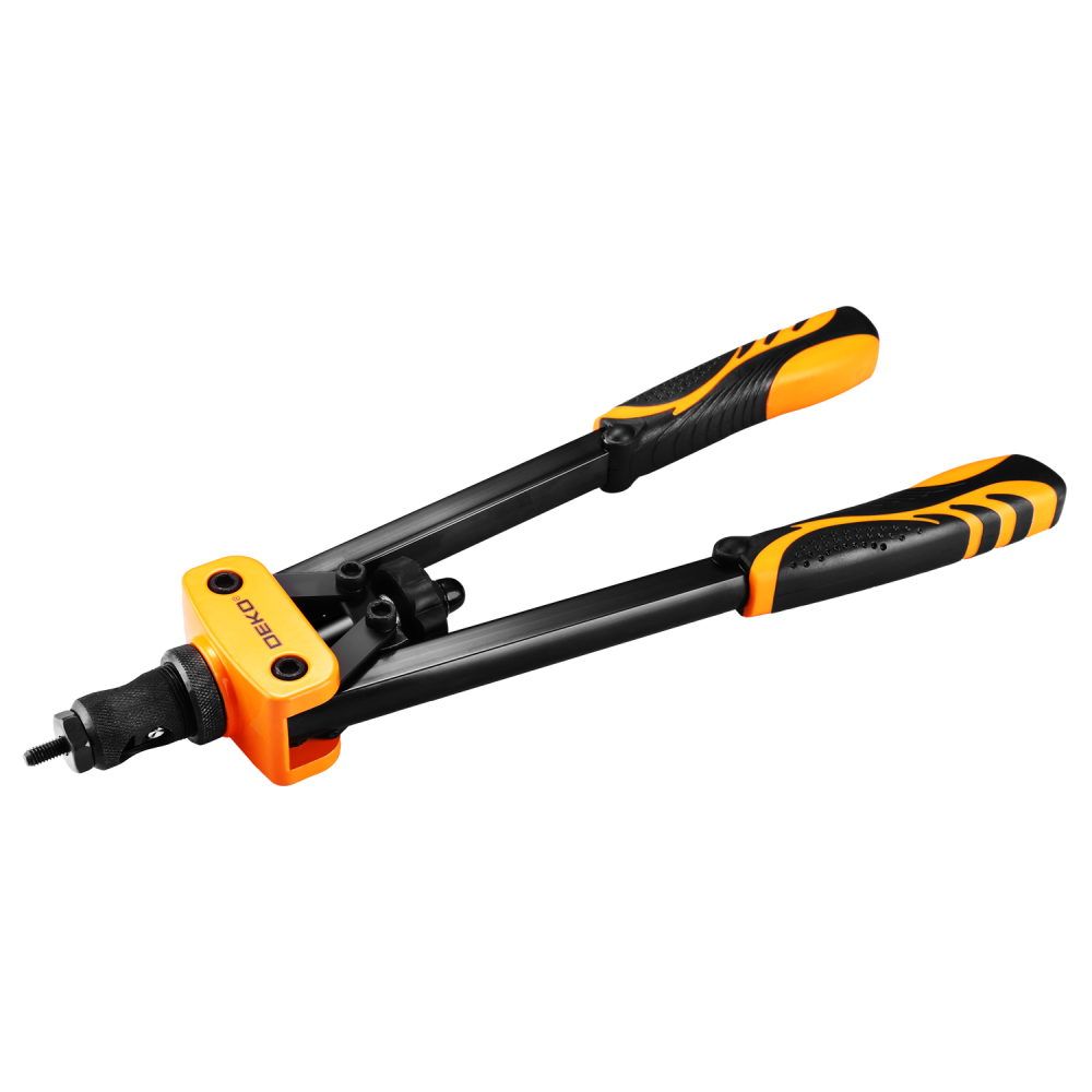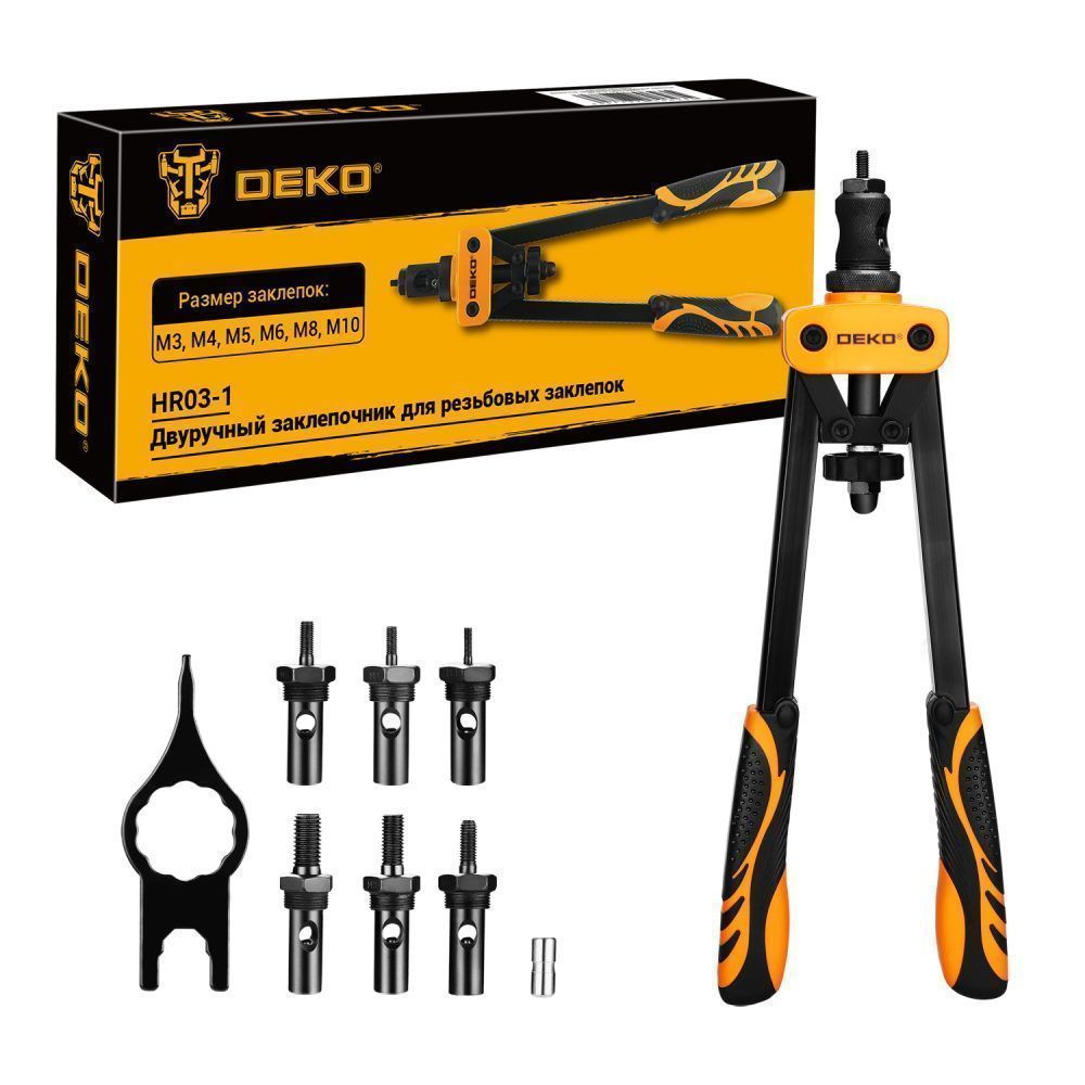 - Двуручный заклепочник DEKO HR03-1 предназначен для установки резьбовых заклепок (медних, алюминиевых, стальных) диаметром M3–M10 при выполнении монтажных и ремонтных работ по металлу, пластику и композитным материалам. Инструмент востребован при сборке металлоконструкций, оборудования, профильных рам, элементов кузова автомобилей и другой техники, где требуется создание прочного резьбового соединения в тонкостенных деталях.